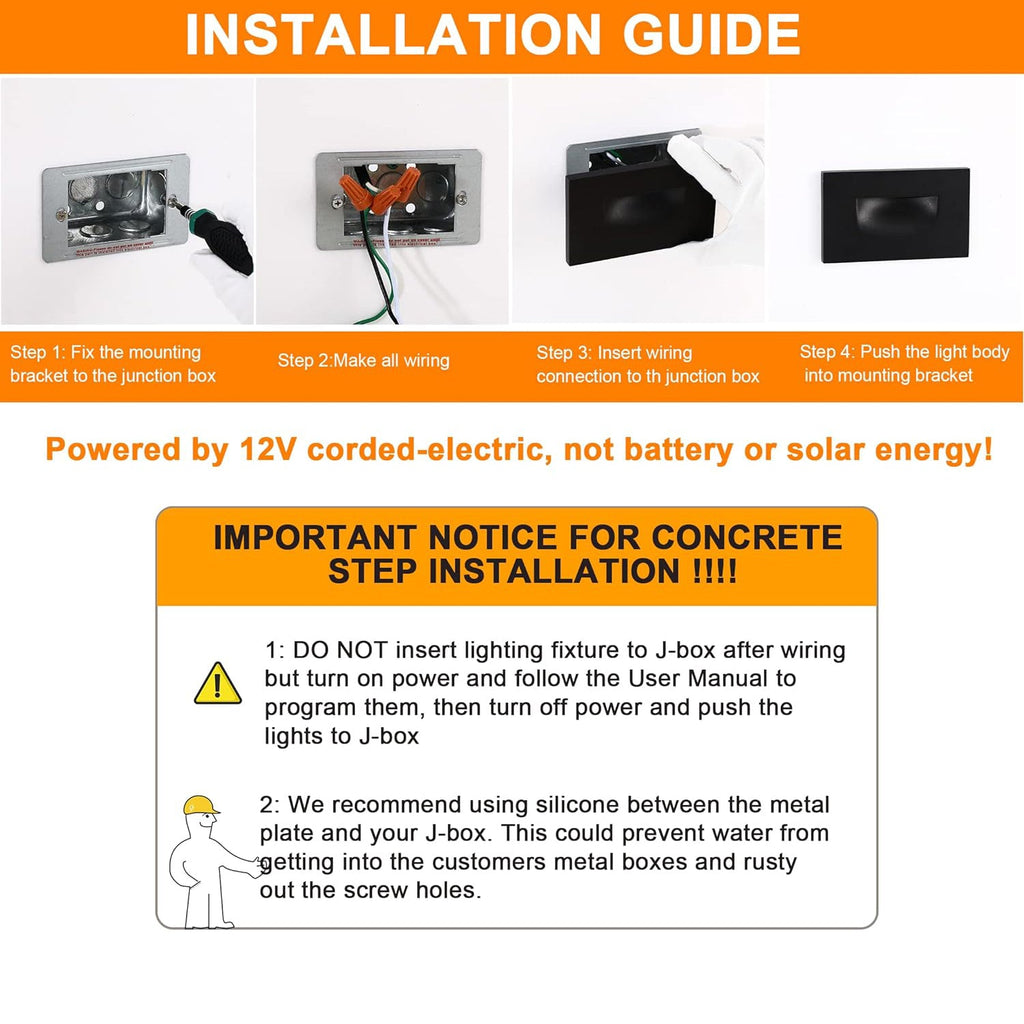 The size of this horizontal LED step light is 2.875 (H) x 4.75” (W) x 1.5” (D). It's the perfect size for a standard bell box, so its location can be pre-installed and wired and ready for the fixture installation. This rectangular step light has a waterproof rating of IP65 so the moist weather won't be a fact to damage. The short cable is connected from its backside for low voltage connection. This high-quality product will serve you greatly.