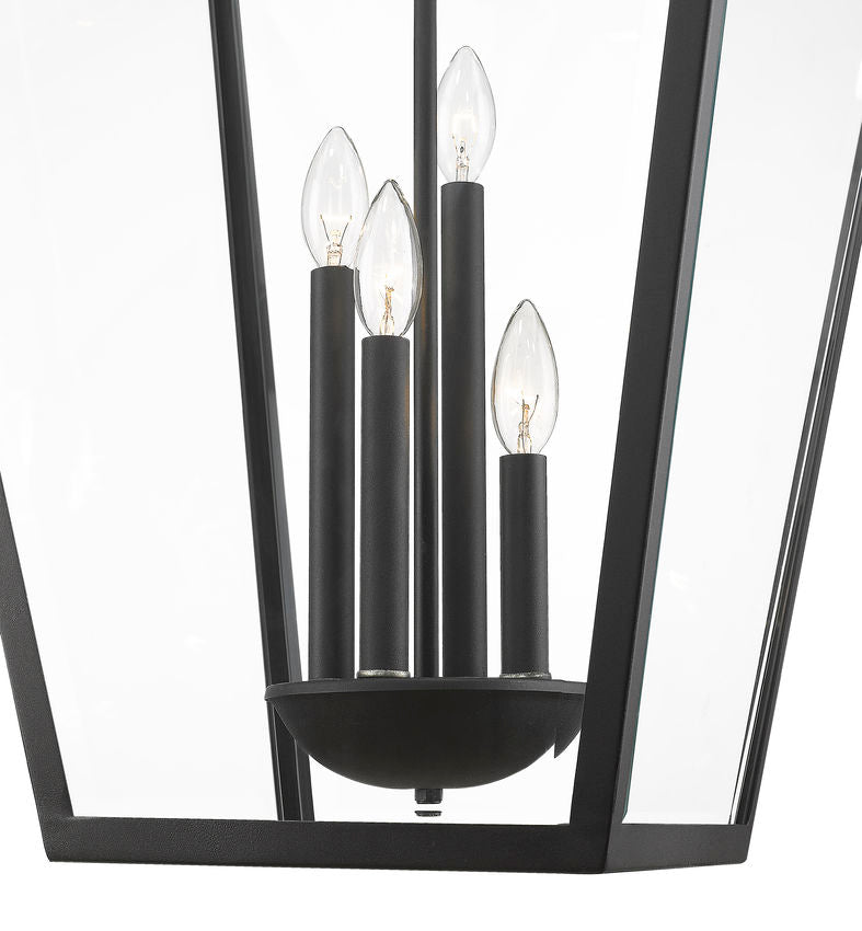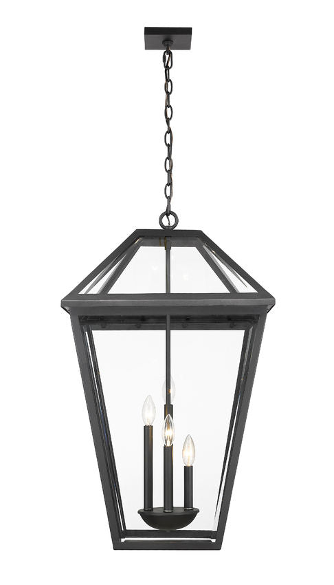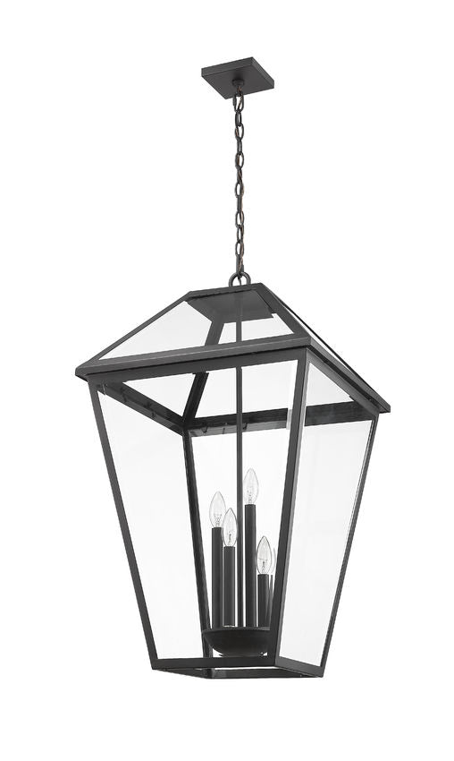 Talbot 579CHXLX 4 Outdoor Chain Mount Ceiling Hanging Pendant Fixture 19.5" x 19.5" x 32.25" Black Stainless Steel and Iron Clear Beveled Glass Line Voltage Candelabra 120V 4 E12 Base Sockets for Garden, Exterior Lighting