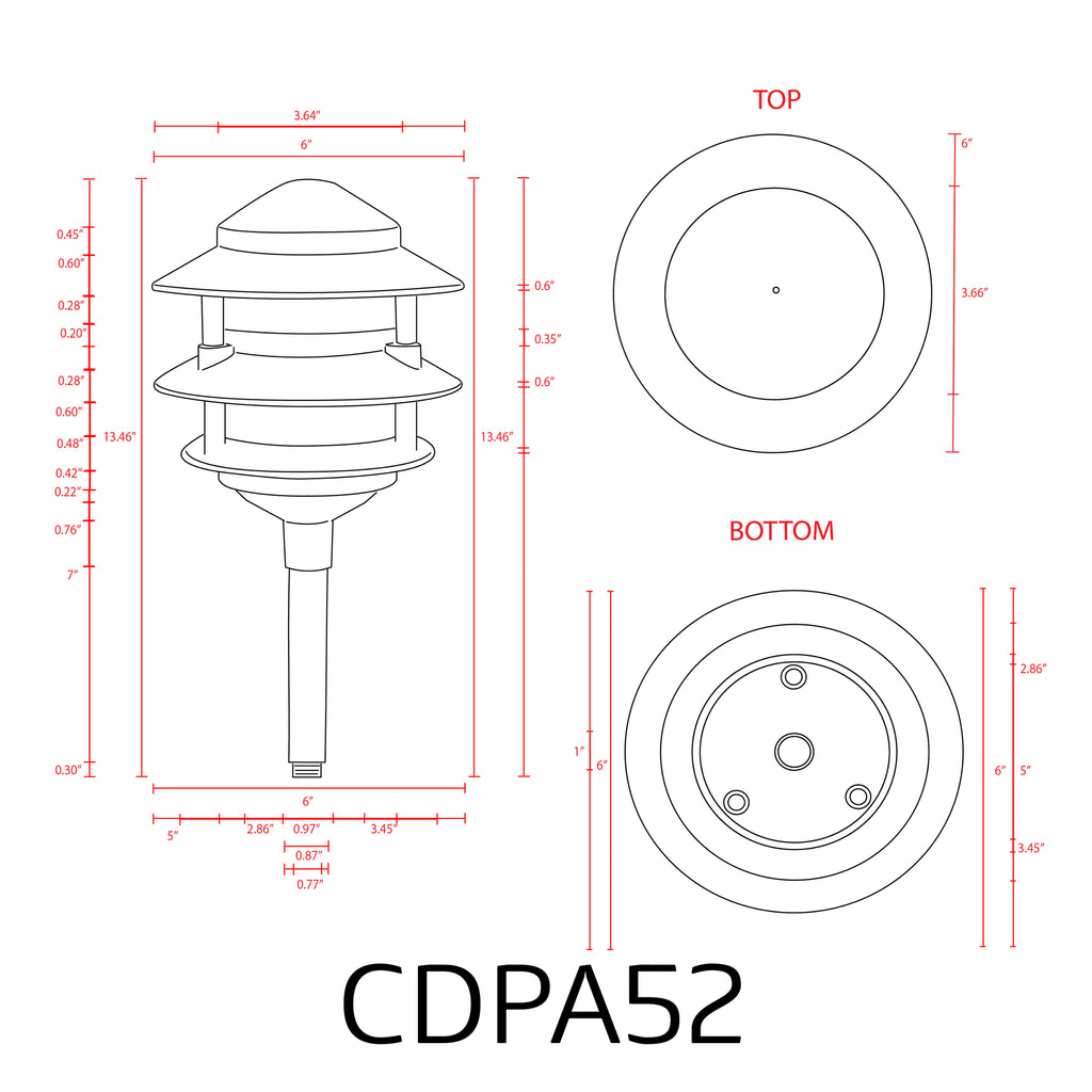 The CDPA52 is an integrated 3W LED 3 Tier Pagoda mushroom landscape light and a perfect choice for an affordable, yet durable outdoor landscape lighting FixtureThis low voltage pagoda landscape pathway lights with a 3-tier light has a timeless design. It's great for pathways, planters and driveways. The pagoda landscape light includes a 6" Height pole and ground stake. This high-quality landscape low voltage path light is made up of heavy-duty cast aluminum material which gives a solid construction for durability and longevity.