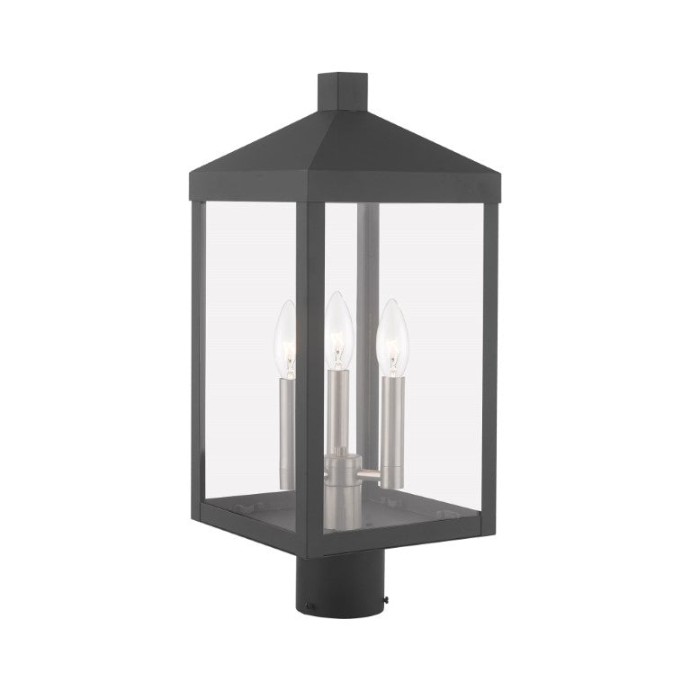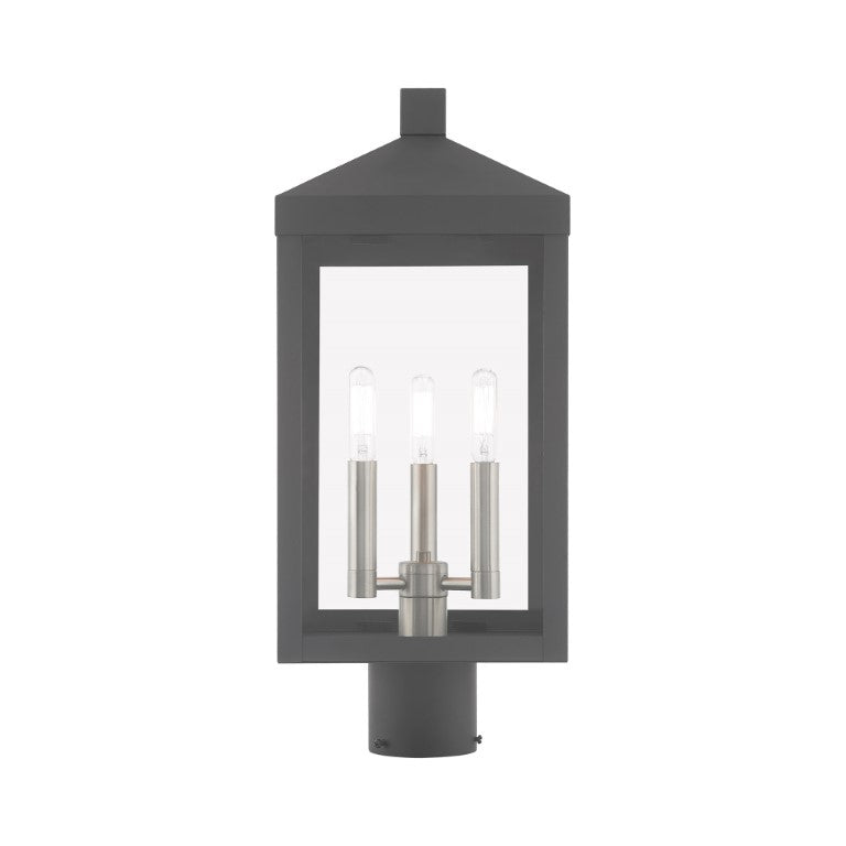Nyack Outdoor Classics 3 E12 Candelabra Base Light Bulb Socket Medium Outdoor Post Top Lantern 8.25" x 8.25" x 19.5" Solid Brass and Clear Glass with Scandinavian Gray with Brushed Nickel Finish 120V for Garden, Exterior Post - 20592-76
