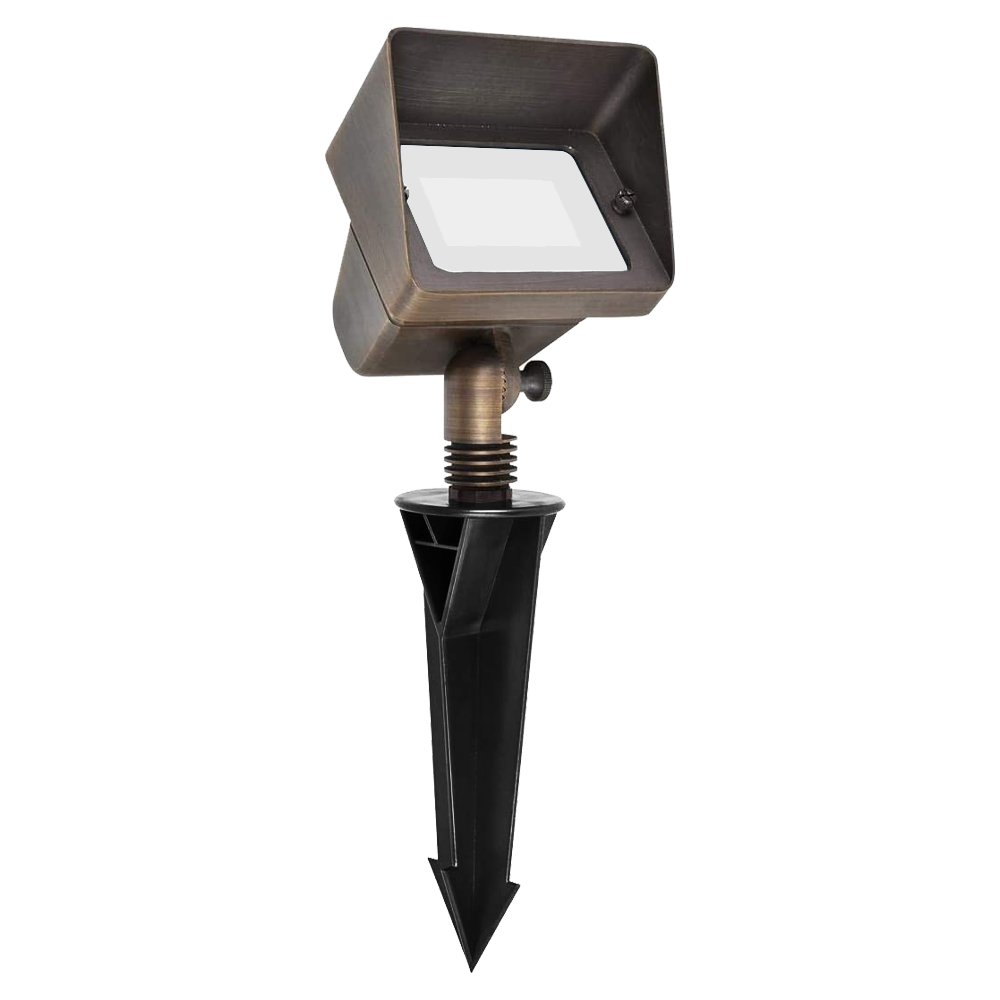 An adjustable 3W-10W AC/DC 12V LED built in 3CCT LED bulb gives it a range of choice between 3000K Warm White, 4000K Natural White, and 5000K Cool White light color temperature. This adjustable brass LED flood light is built with IP65 waterproof technology so it can last through many weather conditions. The size of this directional up light is 5.3" (L) x 5.9" (W) x 3.7" (H) x 2.3"(Base). An ABS ground spike is included for staking purposes and durability in the ground.
