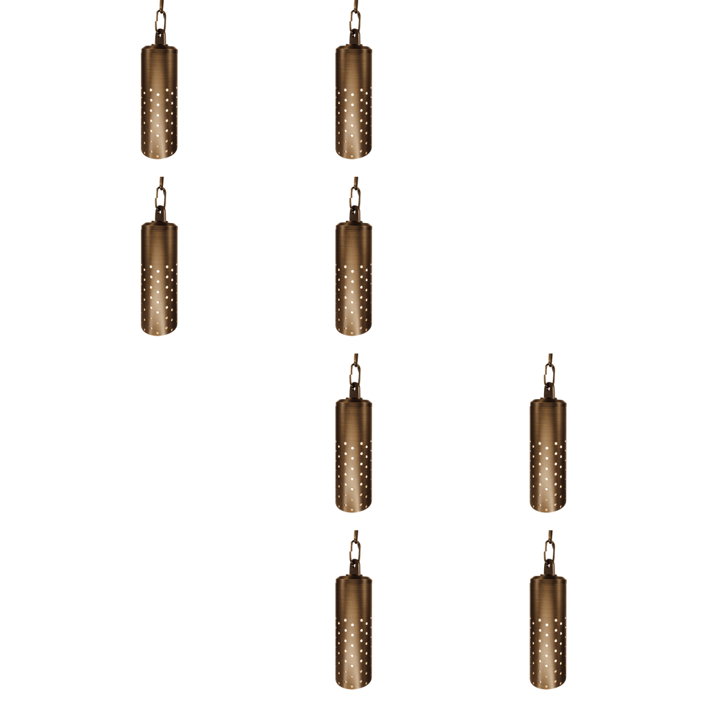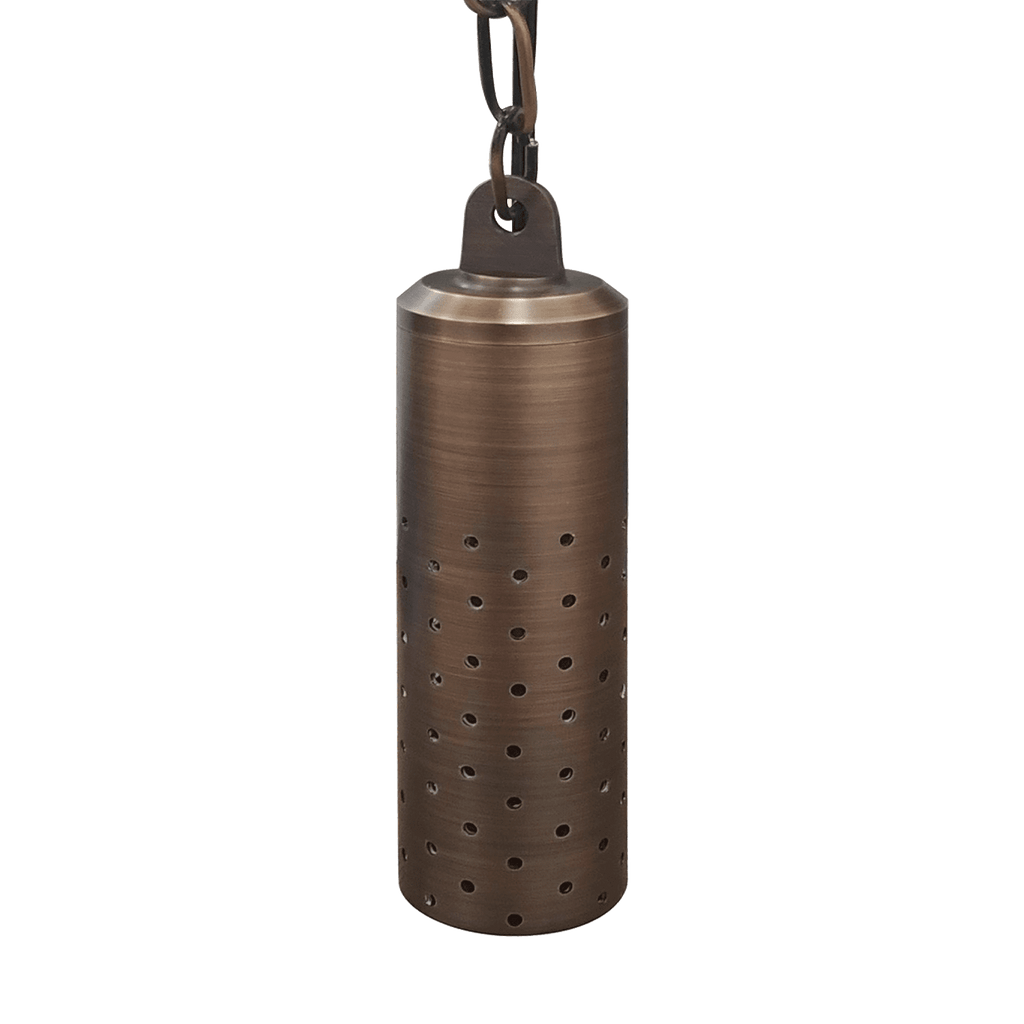 This vintage style LED brass hanging pendant light creates a center of attraction with its unique and elegant design to your interior or exterior space. This low voltage cylinder pendant spotlight is made of heavy-duty cast brass which gives a solid construction for durability and longevity. With the holes scattered around the sides of the fixture, it gives it a star lighting design as it shines on object and landscaping around it. A 40" chain is also included so that you can make it a suitable height by shortening the chain to fit your house.