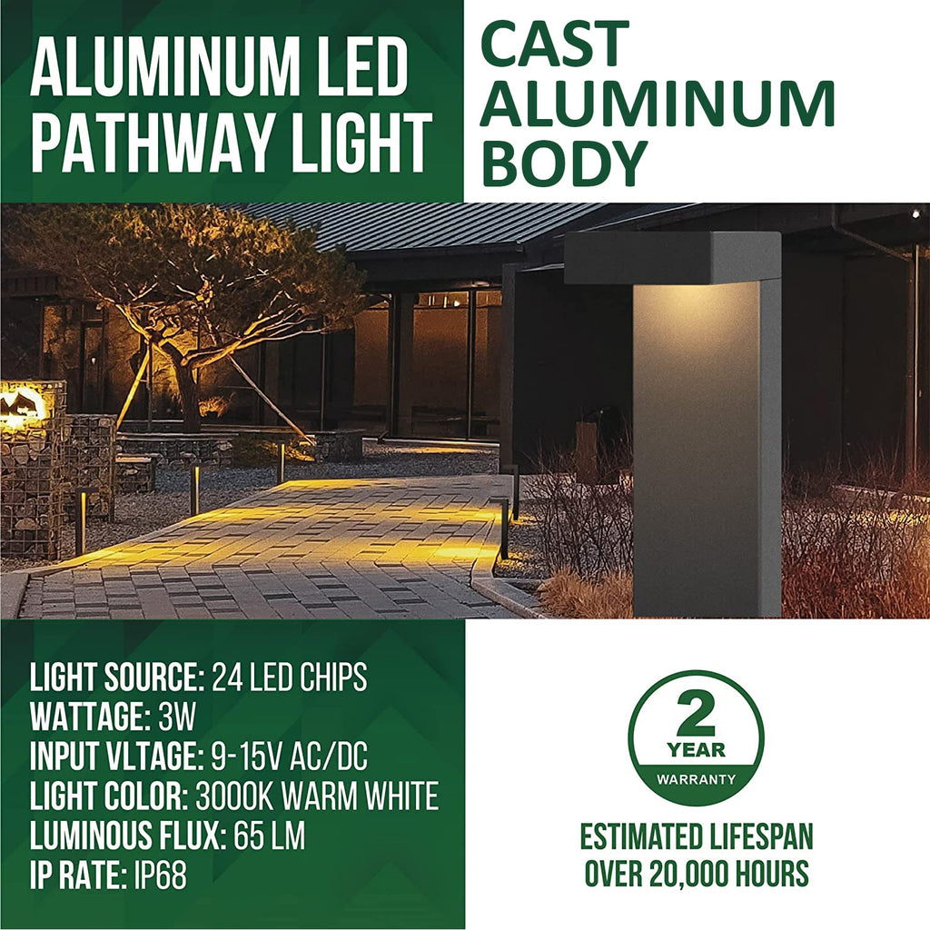 With 24pcs 3000k LED integrated chips, these low voltage LED pathway lights produce a warm and soft light that is free of glare. With modern appearance design, this light will not only light up your garden at night, but also comfort you with high-end atmosphere in the day.
