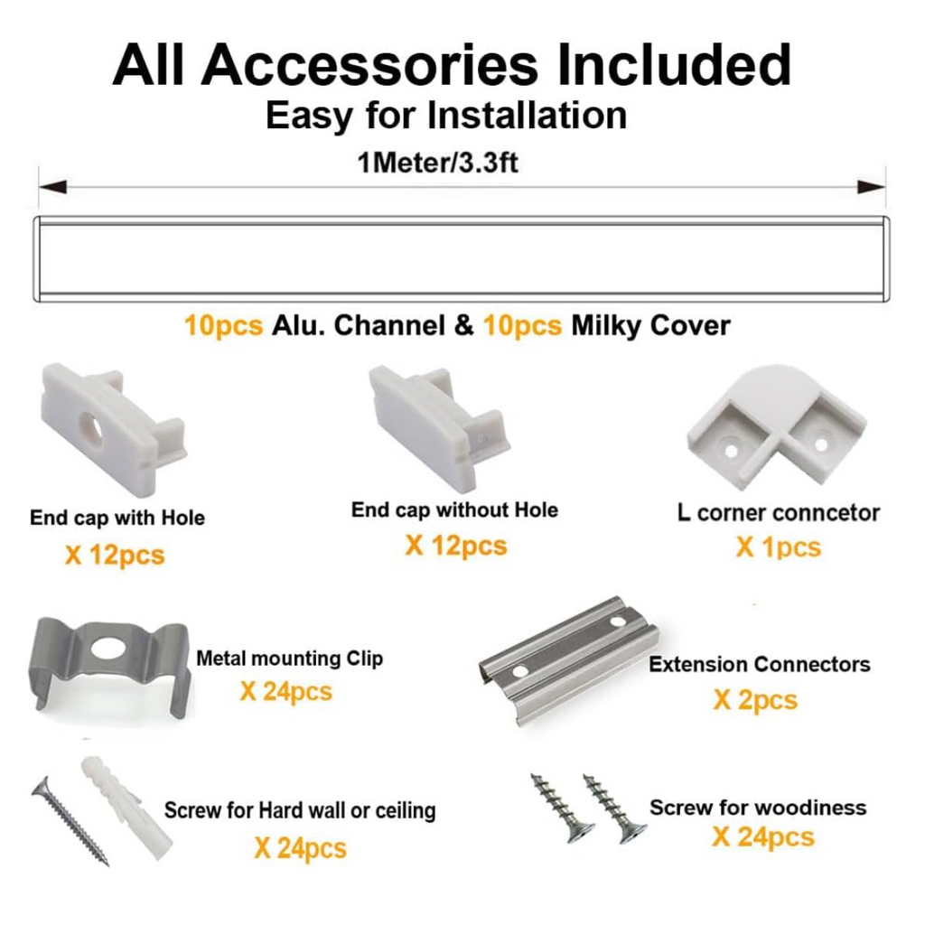 • Included: 10x 1m (3.3ft) Aluminum Channels, 1x L Corner Connector, 2x Extension Connectors, 24x End Caps, 24x Mounting Clips, 24x Mounting Screws