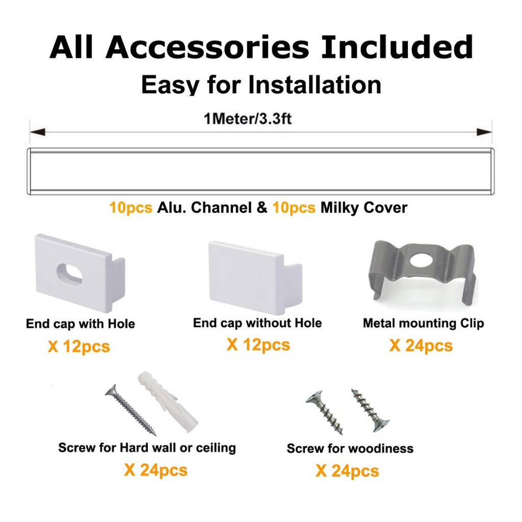 - 10 x 1m/3.3ft Aluminum Channels with Covers