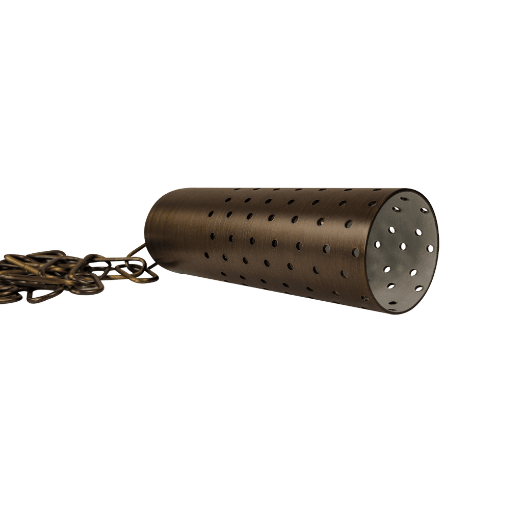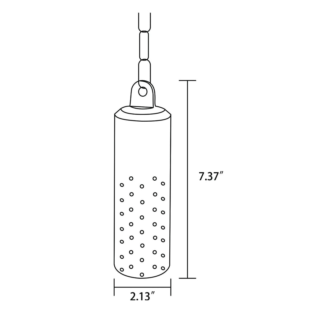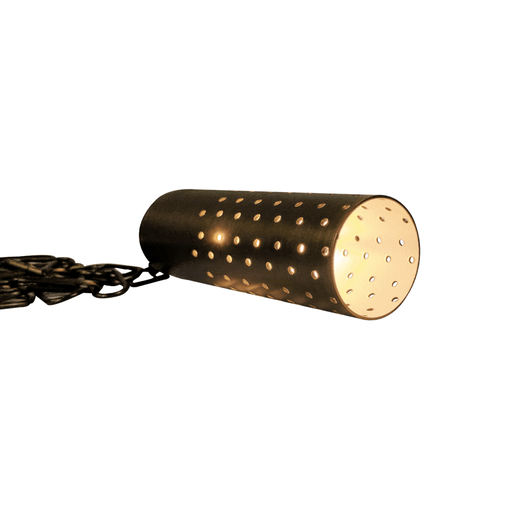 This vintage style LED brass hanging pendant light creates a center of attraction with its unique and elegant design to your interior or exterior space. This low voltage cylinder pendant spotlight lighting is made of heavy-duty cast brass which gives a solid construction for durability and longevity. With the holes scattered around the sides of the fixture, it gives it a star lighting design as it shines on object and landscaping around it. A 40" chain is also included so that you can make it a suitable height by shortening the chain to fit your house.