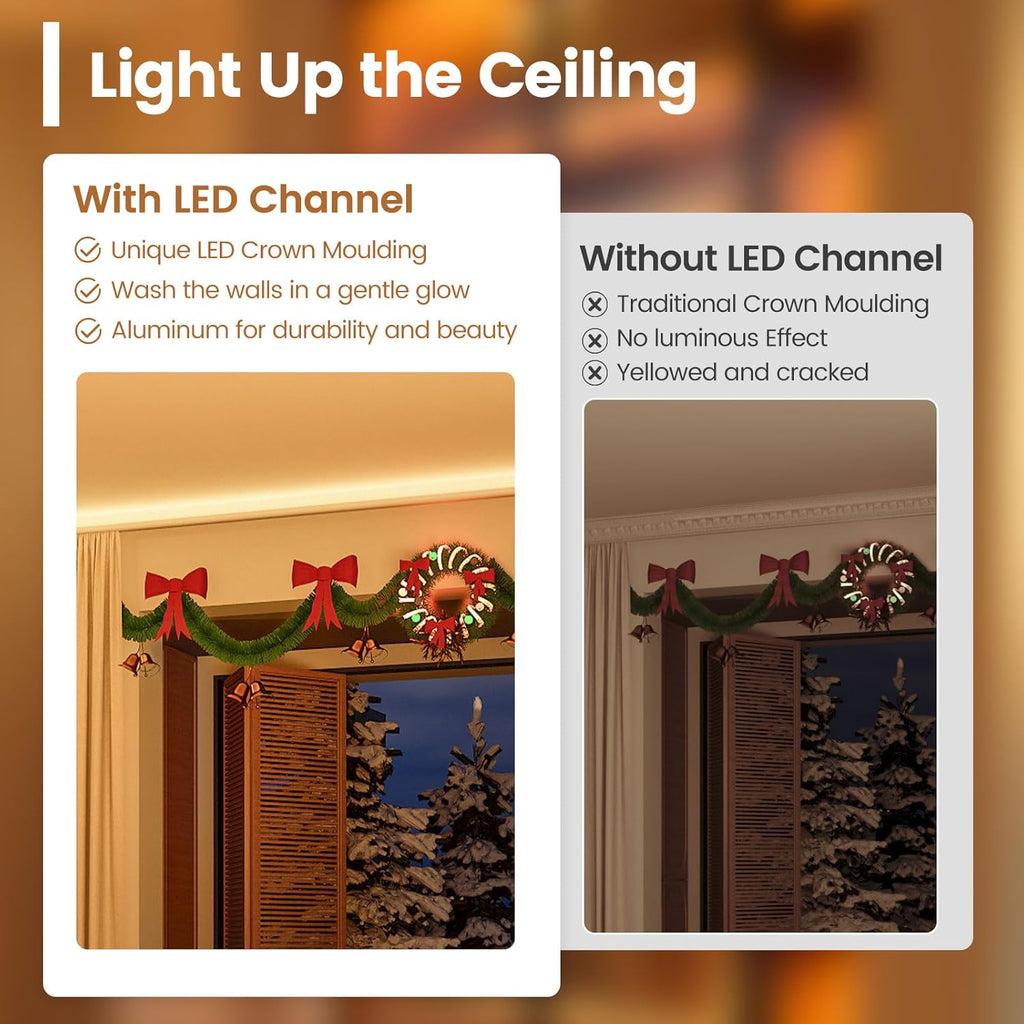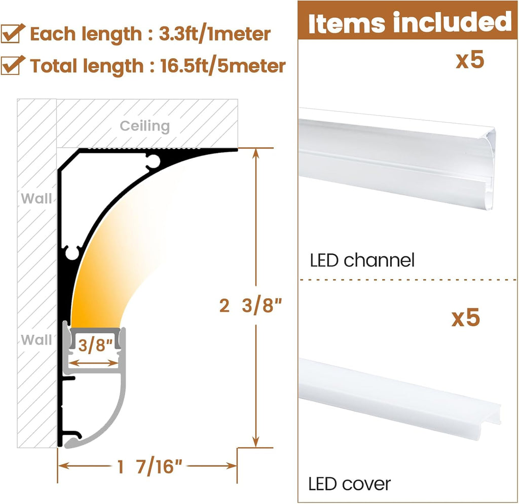 AC02 Aluminum Channel Crown Moulding Trim with Diffuser 5-Pack 3.3FT/1M (5M) For Strip Lights