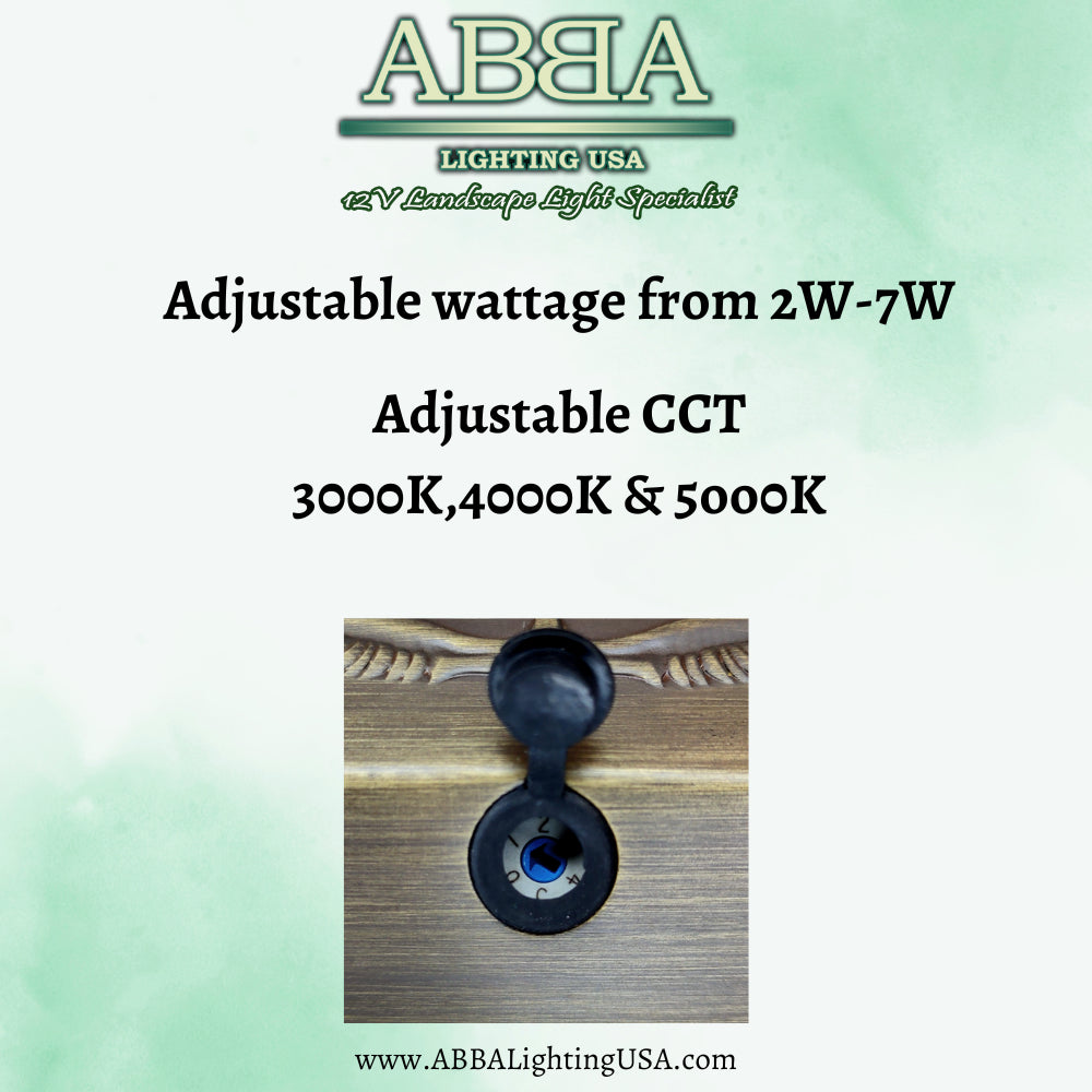 An adjustable 2W-7W AC/DC 12V LED built in 3CCT LED bulb gives it a range of choice between 3000K Warm White, 4000K Natural White, and 5000K Cool White light color temperature. This adjustable brass LED flood light is built with IP65 waterproof technology so it can last through many weather conditions. The size of this directional up light is 3.875" (L) x 2" (W) x 2" (H) x 2.75"(B). An ABS ground spike is included for staking purposes and durability in the ground.