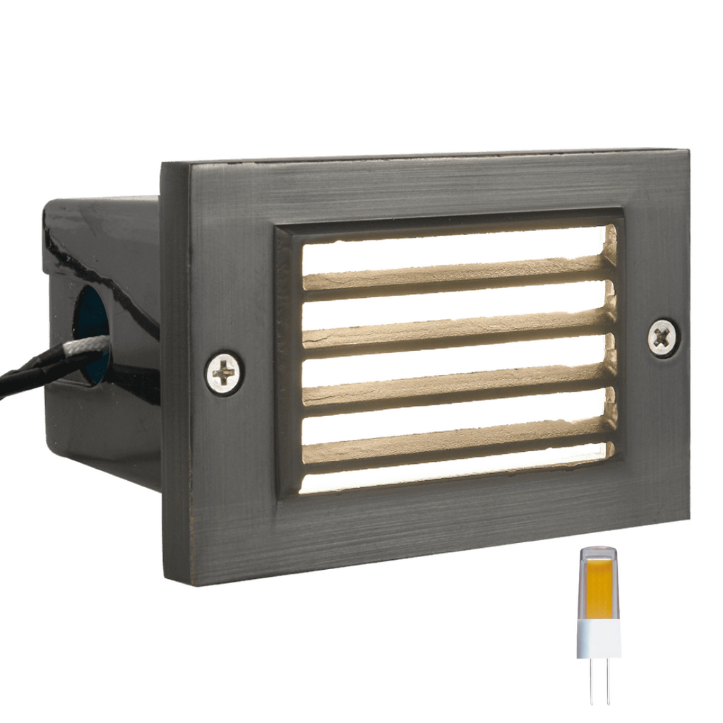 It includes a Bi-Pin Base for use with a G4 LED bulb to give it the lighting temperature you desire for your step light features and is 12V making it an energy-efficient choice. Its size is 4.5" (L) x 3" (H) x 3.15" (W) and is ETL listed. This surface mounted LED light is very easy to install and IP65 waterproof, so it's very useful for outdoor wet locations. It is available in a natural brass finish or a dark brass finish.