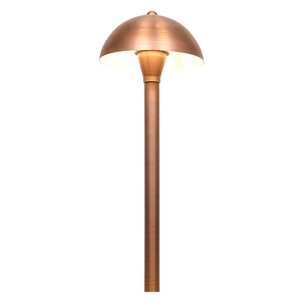 The PLB08 LED brass mushroom path & area light with ABS ground spike stake with globe hat consumes less energy than incandescent lights and is IP65 waterproof, making it a reliable and cost-saving lighting fixture for your home's exterior space. This high-quality antique style led pathway light is made of heavy-duty cast brass, giving it a solid construction for durability and a lifetime of beauty. One of the most elegant Brass low voltage Landscape Lighting of its kind. Its hat size is 6.6" x 3" and pole size is 18".As part of a wired outdoor lighting setup, it offers steady, uninterrupted illumination and a long-lasting solution for your landscape needs.