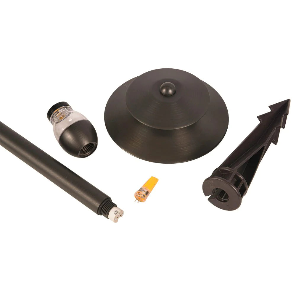 It's hat size 6" x 3" and pole size 17". It's easy to assemble, ABS ground spike is also included for staking into the ground. Bi-pin base G4 12V LED Bulbs can be added to bring a 3000K warm white light glow and create a comfortable and pleasing atmosphere. It’s a perfect choice for general site garden path lighting, alleys, loading docks, lawns, balconies, doorways, bus stations, streets, pathways, and parking areas.