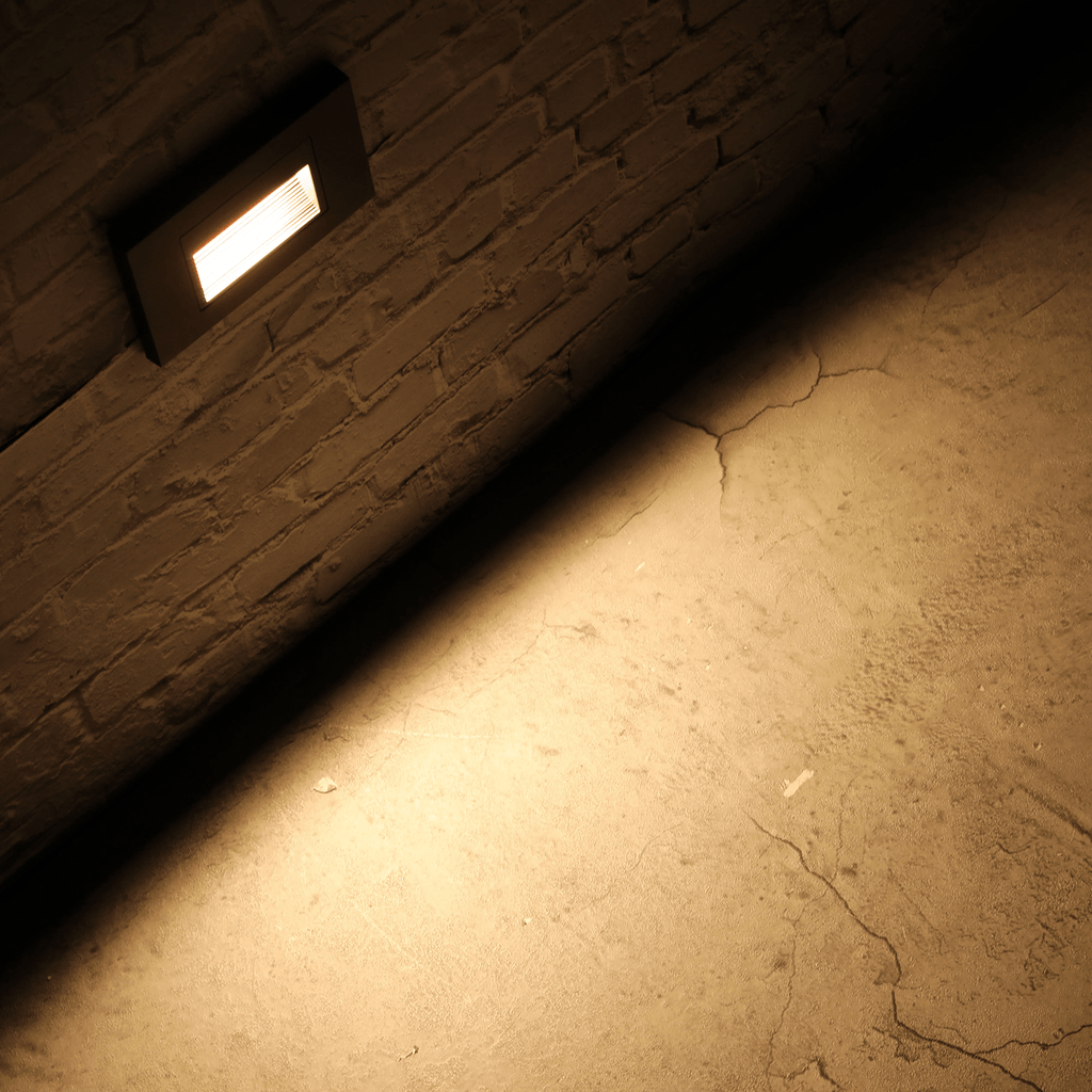 The size of this horizontal LED step light is 2.875 (H) x 4.75” (W) x 1.5” (D). It's the perfect size for a standard bell box, so its location can be pre-installed and wired and ready for the fixture installation. This rectangular step light has a waterproof rating of IP65 so the moist weather won't be a fact to damage. The short cable is connected from its backside for low voltage connection. This high-quality product will serve you greatly.