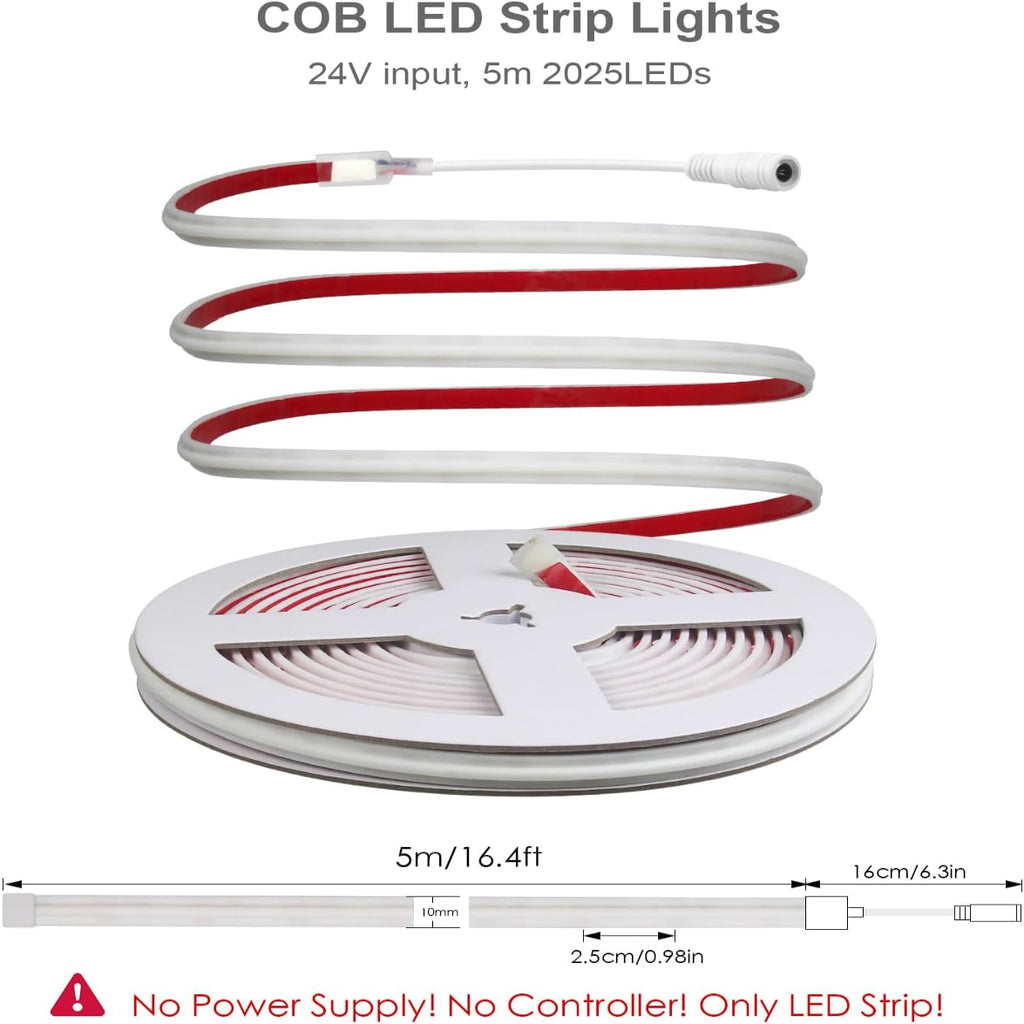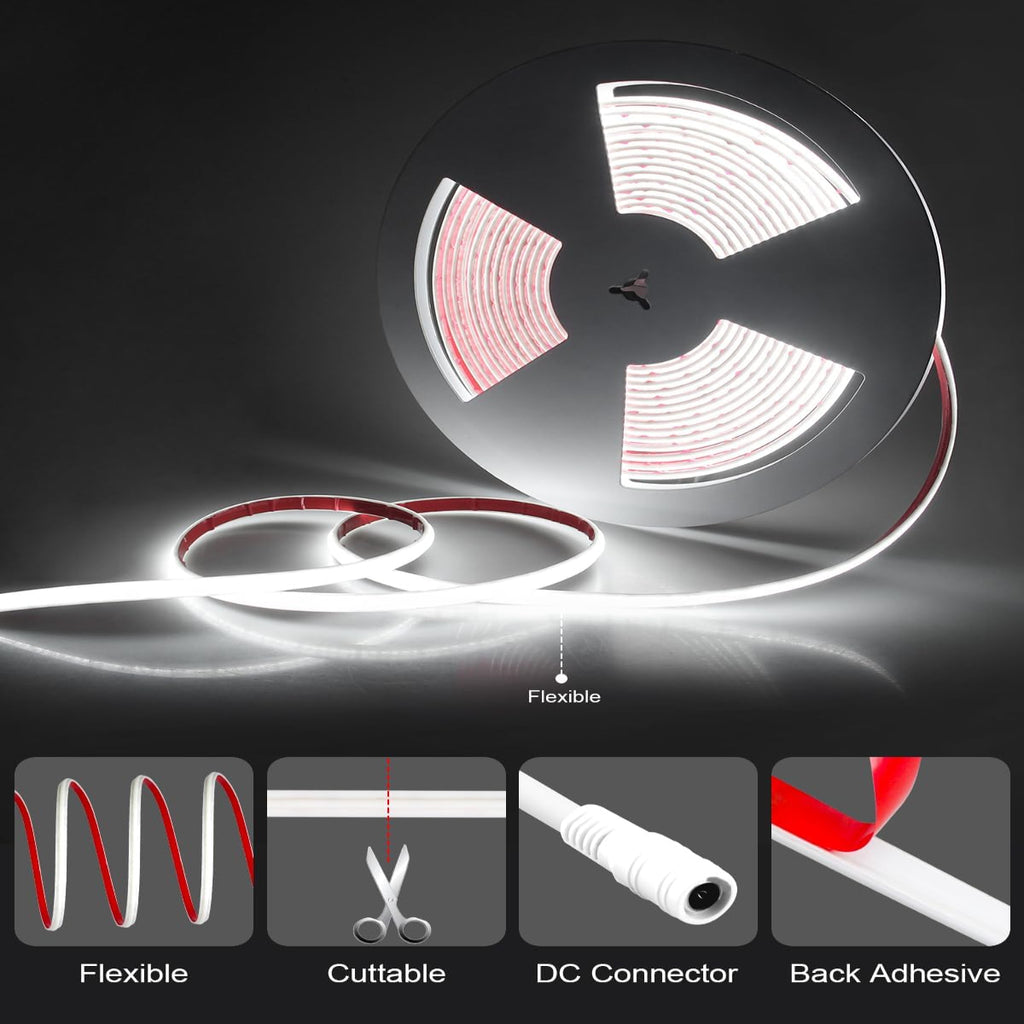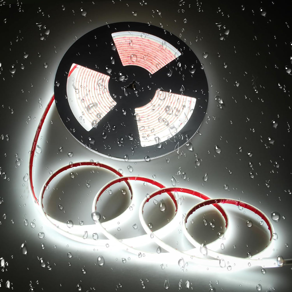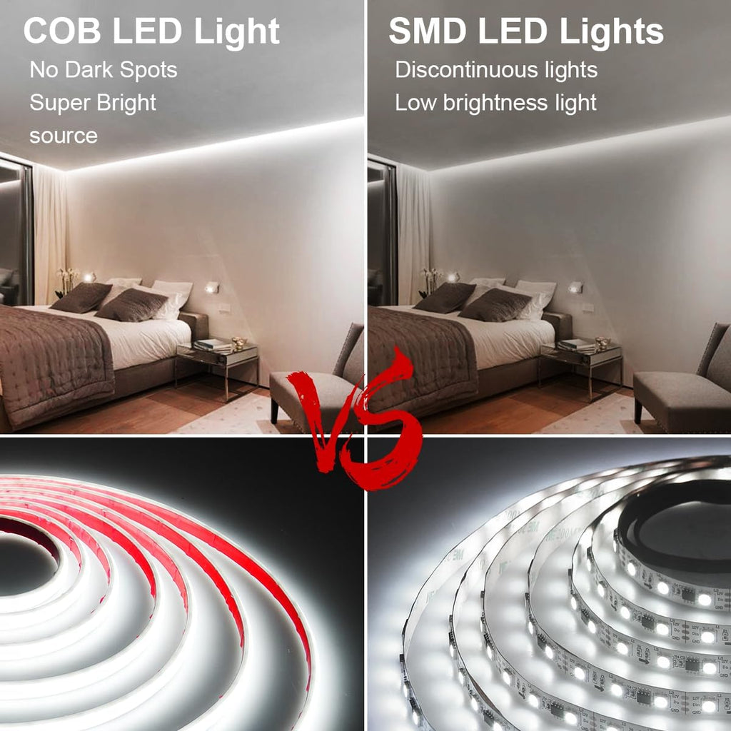 Upgrade your lighting setup with the 24V COB LED Strip Light, designed to provide seamless, ultra-bright illumination. Unlike traditional SMD outdoor led lights strips, this advanced COB LED technology features 240 LEDs per meter (1200 LEDs in total) for a softer, uniform glow without dark spots. Perfect for indoor and outdoor ambiance, this 3000K warm white or 6500K Cool White LED rope light enhances any space with vibrant, high-CRI (90+) lighting.
