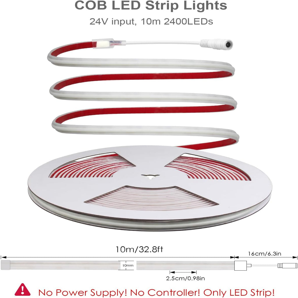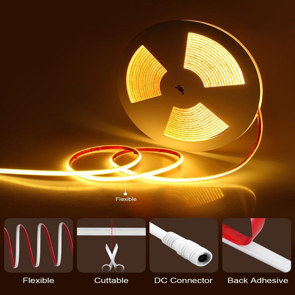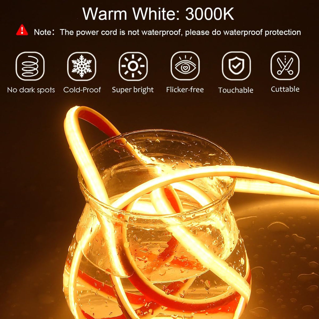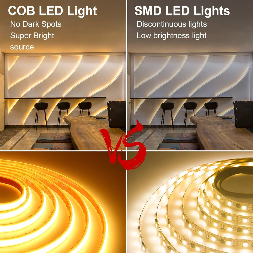 Upgrade your lighting setup with the 24V COB LED Strip Light, designed to provide seamless, ultra-bright illumination. Unlike traditional SMD outdoor led lights strips, this advanced COB LED technology features 240 LEDs per meter (1200 LEDs in total) for a softer, uniform glow without dark spots. Perfect for indoor and outdoor ambiance, this 3000K warm white or 6500K Cool White LED rope light enhances any space with vibrant, high-CRI (90+) lighting.