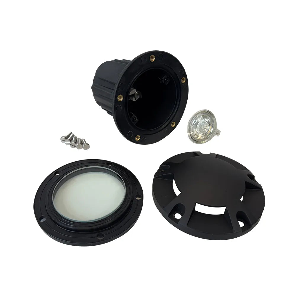 An MR16 12V light bulb is required and can create a pleasant atmosphere. The dimensions of the in-ground spotlight are 5" (L) x 4.875" (W). This round paver lights can easily be assembled in Garage / Basement, Hallway, patio, path, etc since it's IP65 waterproof and ETL listed.