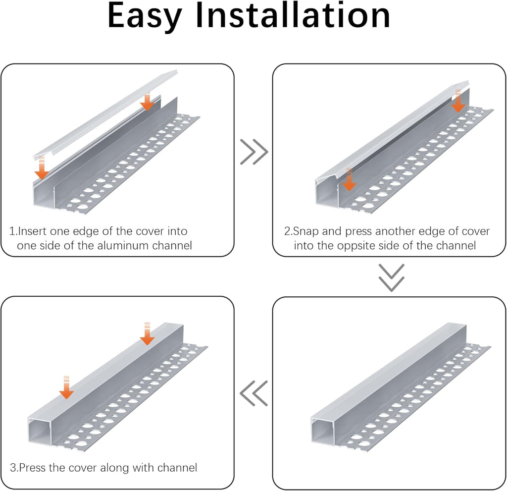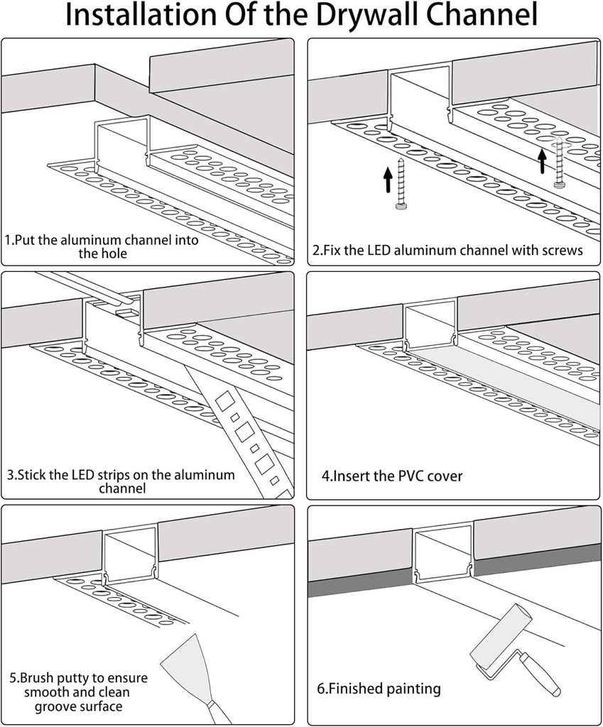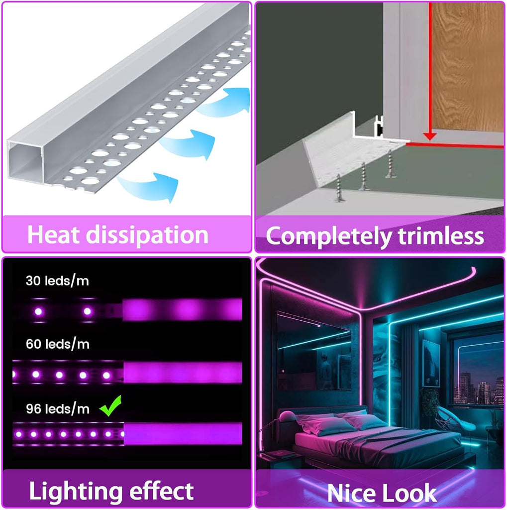 These LED drywall channels are designed to create a completely seamless appearance with no visible aluminum frames. Once installed into plaster, drywall, or gypsum ceilings or walls, the light appears to emanate directly from the surface. Perfect for trim edge and backsplash lighting, as well as accent and ambient lighting in living rooms, kitchens, patios, bedrooms, closets, and more.