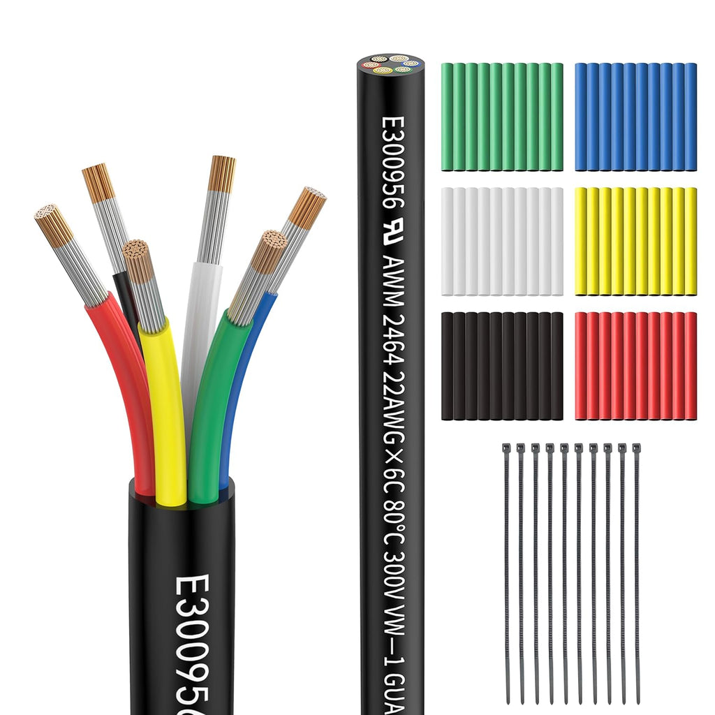 - Length & Design: 50ft or 100ft, black outer jacket, with 6 color-coded wires: Black, Red, Blue, Yellow, White, and Green.