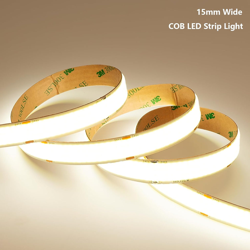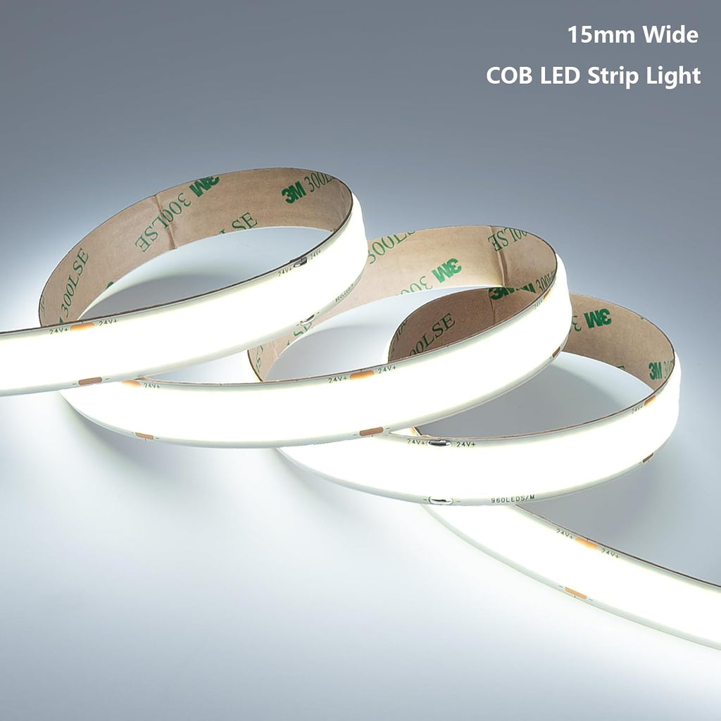 The 15mm wide COB LED strip features a unique 3-row wick design, where two rolls of COB LED strips work in tandem to deliver brighter and more dazzling lighting effects. This design offers a distinct visual experience with enhanced light and shadow effects. -