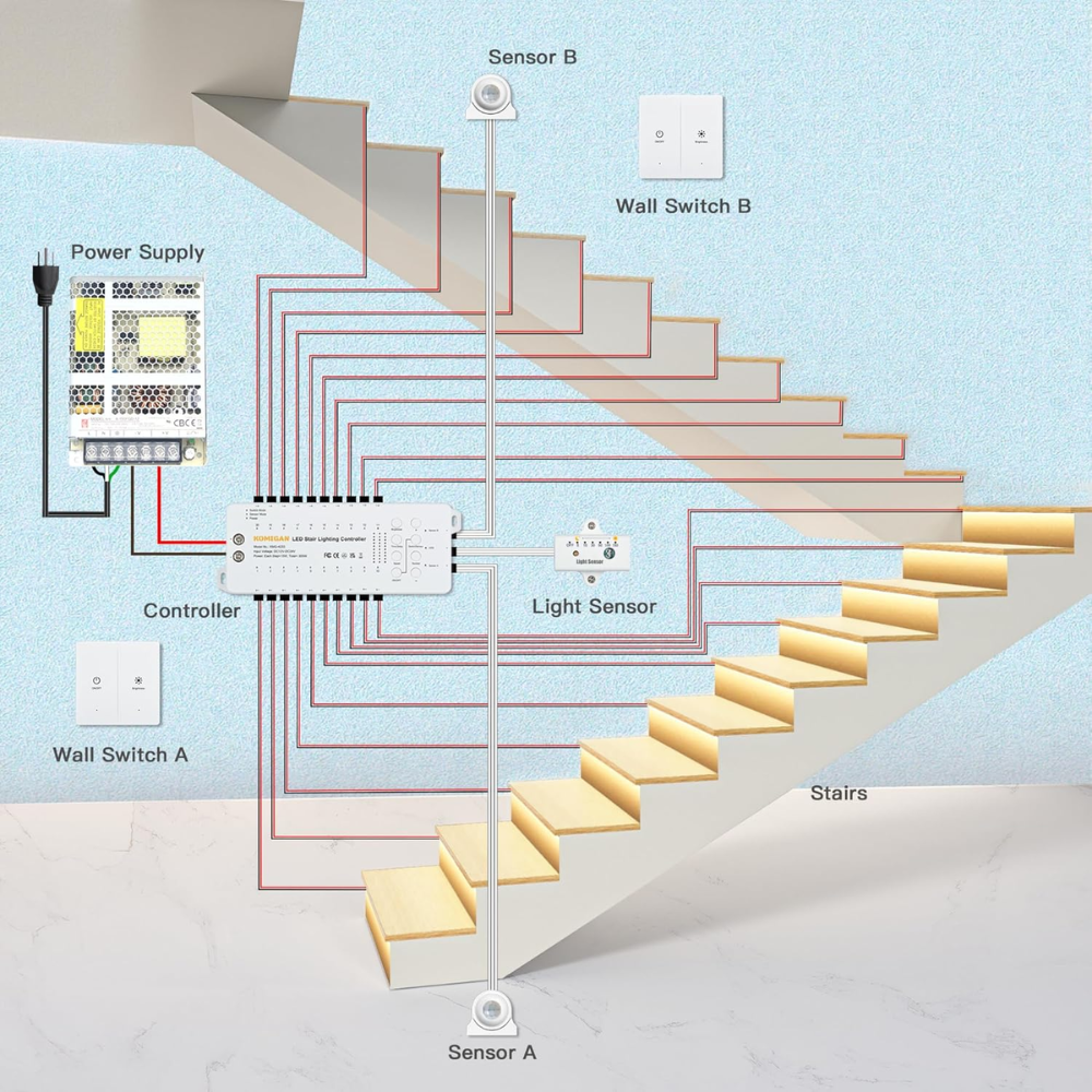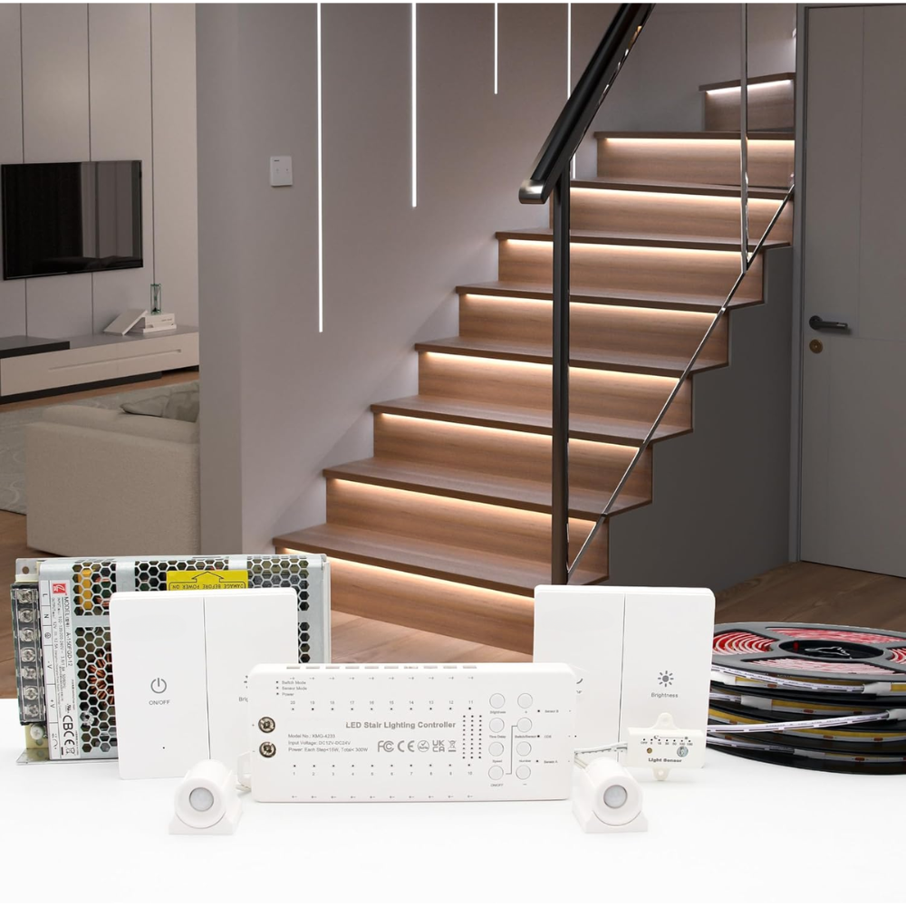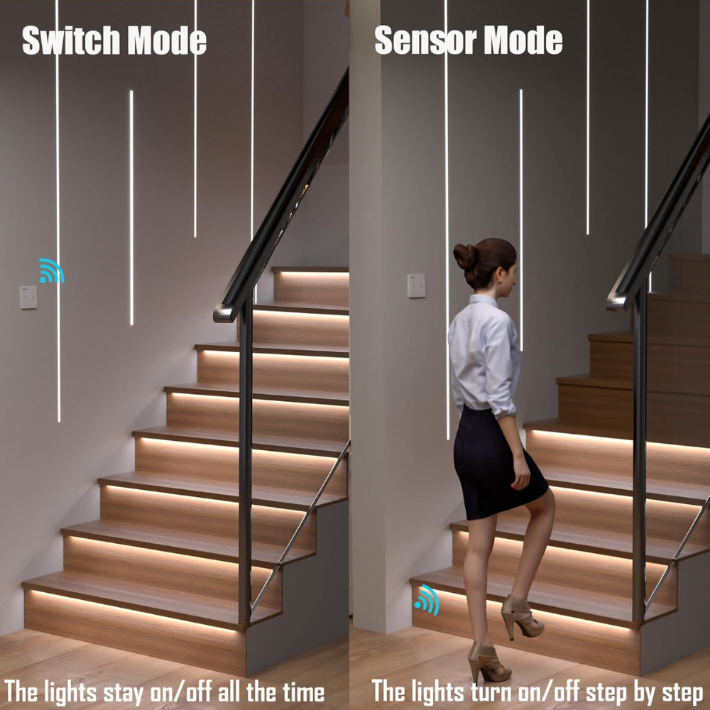 SLMS02 Intelligent Motion Sensor LED COB Strip Light Stair Light Kit 12, 16 or 20 Stairs with Wall Switch 3000K Warm White or 6000K