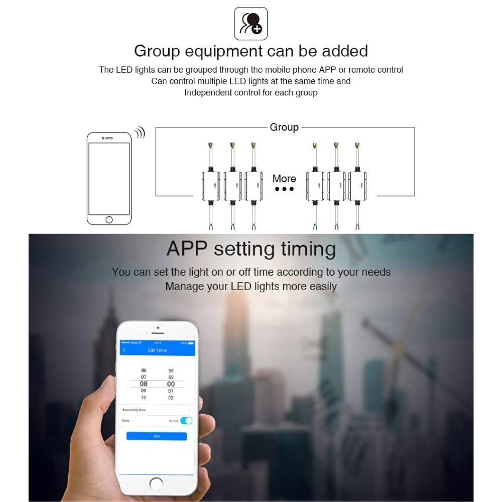 • Compatible con tiras LED de un solo color, tiras de luces CCT, tiras RGB, tiras RGBW, tiras LED RGB+CCT