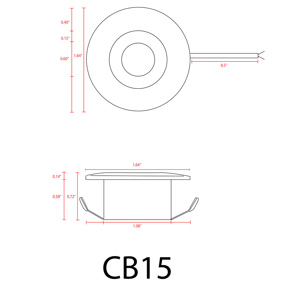 Estas luces de gabinete redondas LED regulables emiten 150 lúmenes, 3000 K o 5000 K de temperatura de luz que crea una atmósfera agradable con un ángulo de haz de 19 grados. Su tamaño es de 1.75" (Diámetro) x .75" (Profundidad) x 1.15" (Recorte).