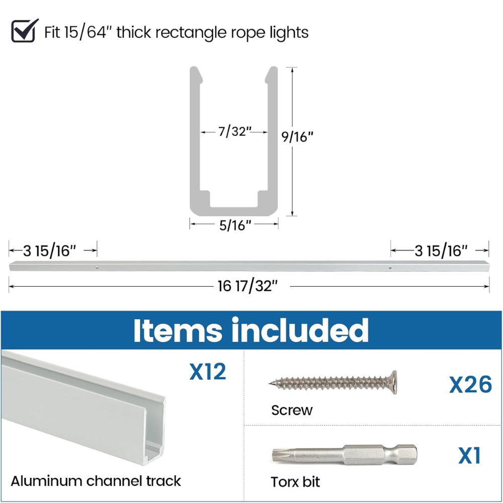 • Included: 12x 1.37ft. Aluminum Channels, 26x Screws included and 1 torx bit