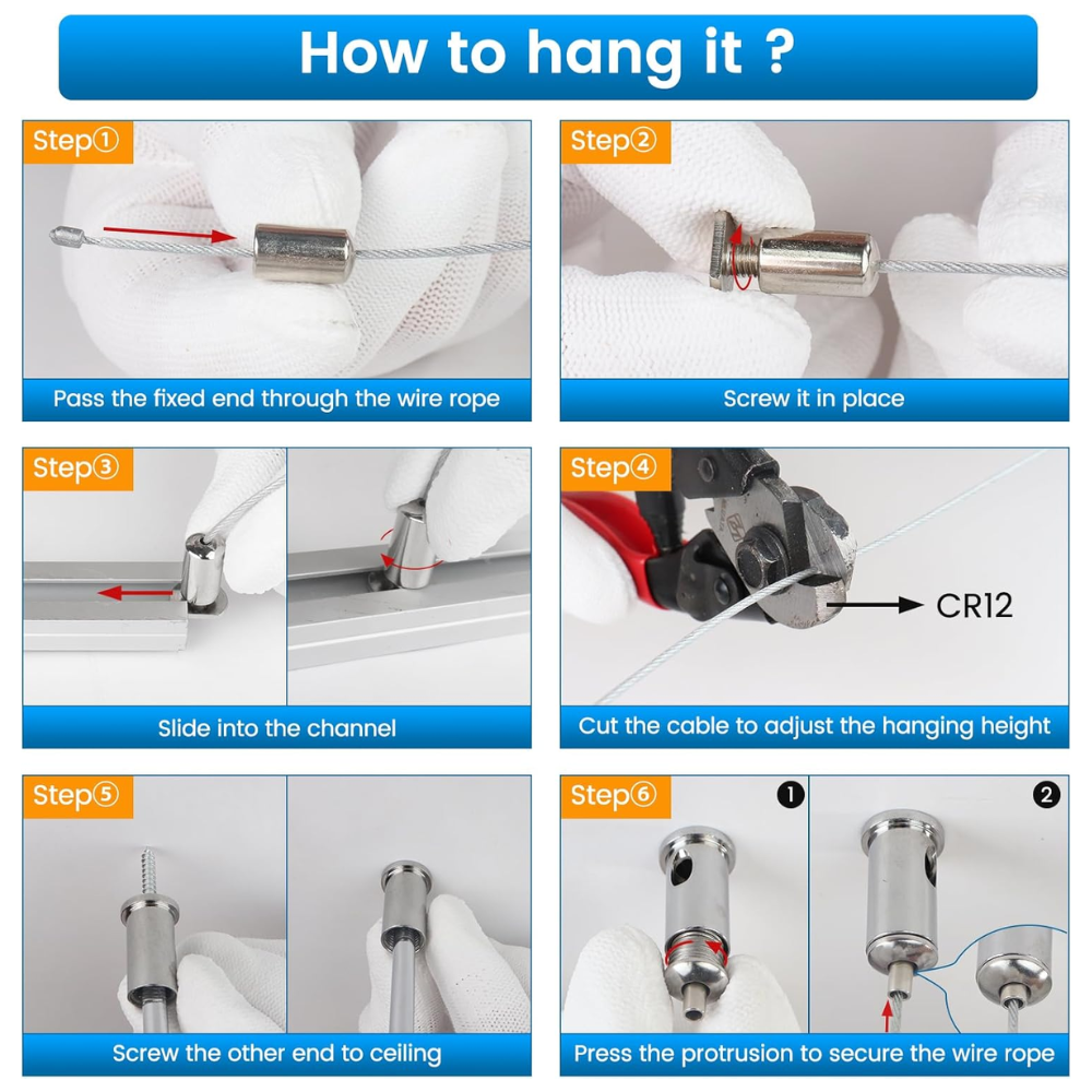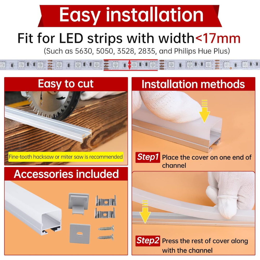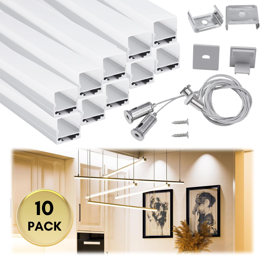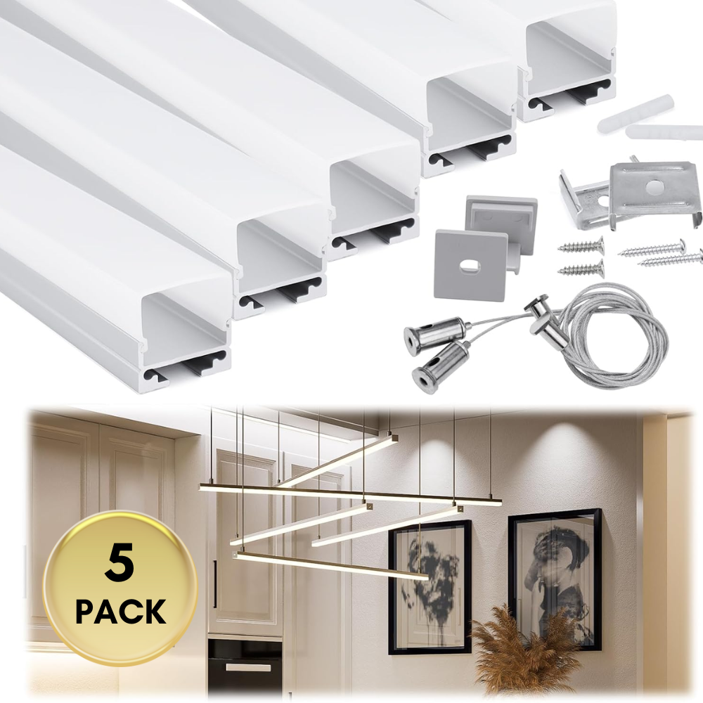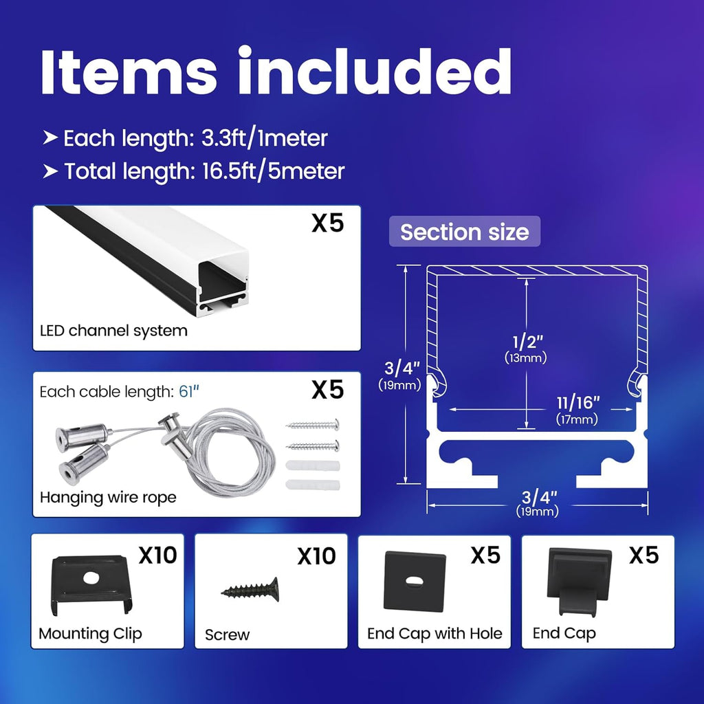 • Included: 5 or 10 Pack of 1M (3.3ft) Aluminum Channels with Diffusers, and each has End Caps with and without Hole, Hanging Wire Rope, Mounting Clips and Mounting Screws