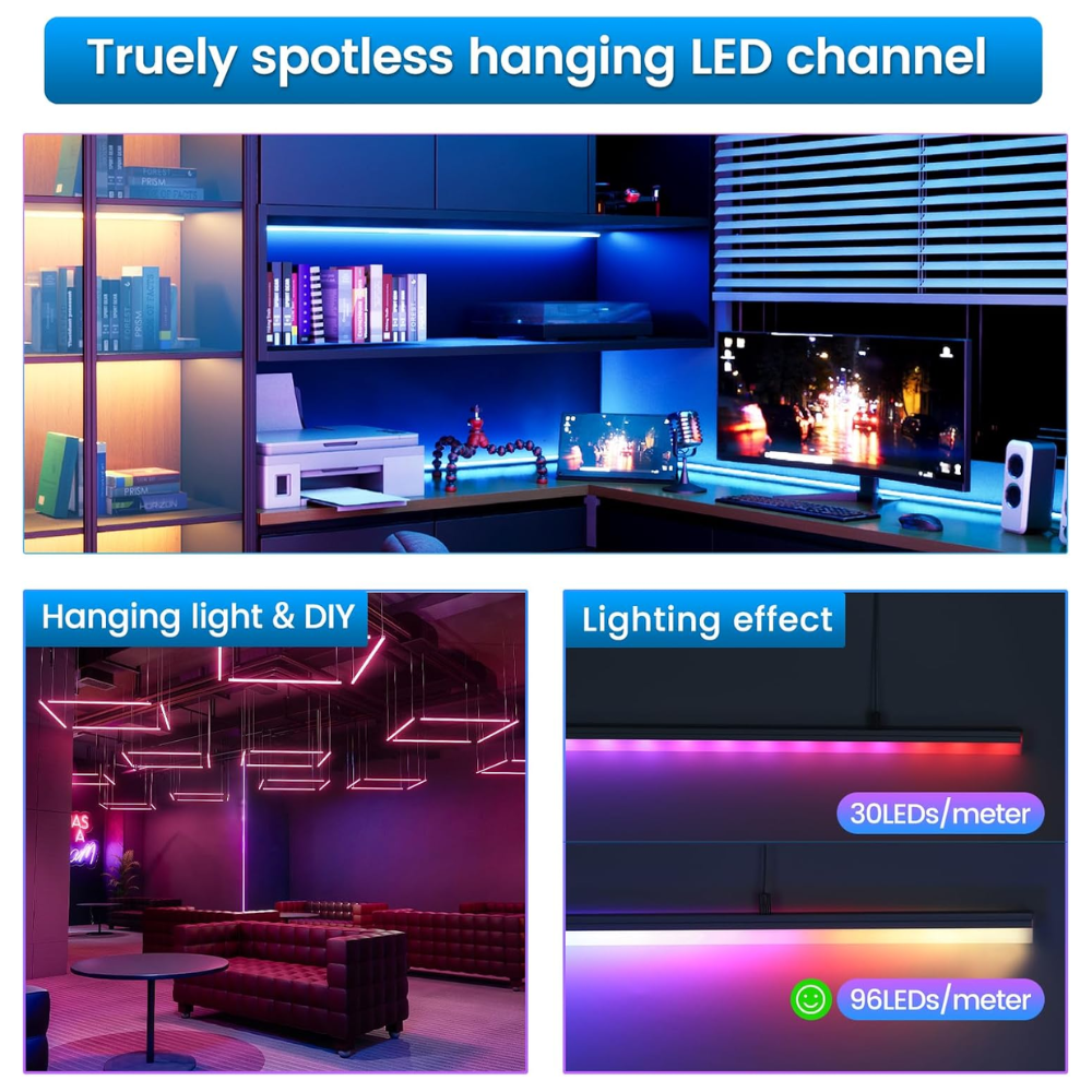 AC15 Spotless Aluminum Channel with Hanging Wire 3.3FT/1M For Max 17mm Width LED Strip Lights Pack of 5 and 10