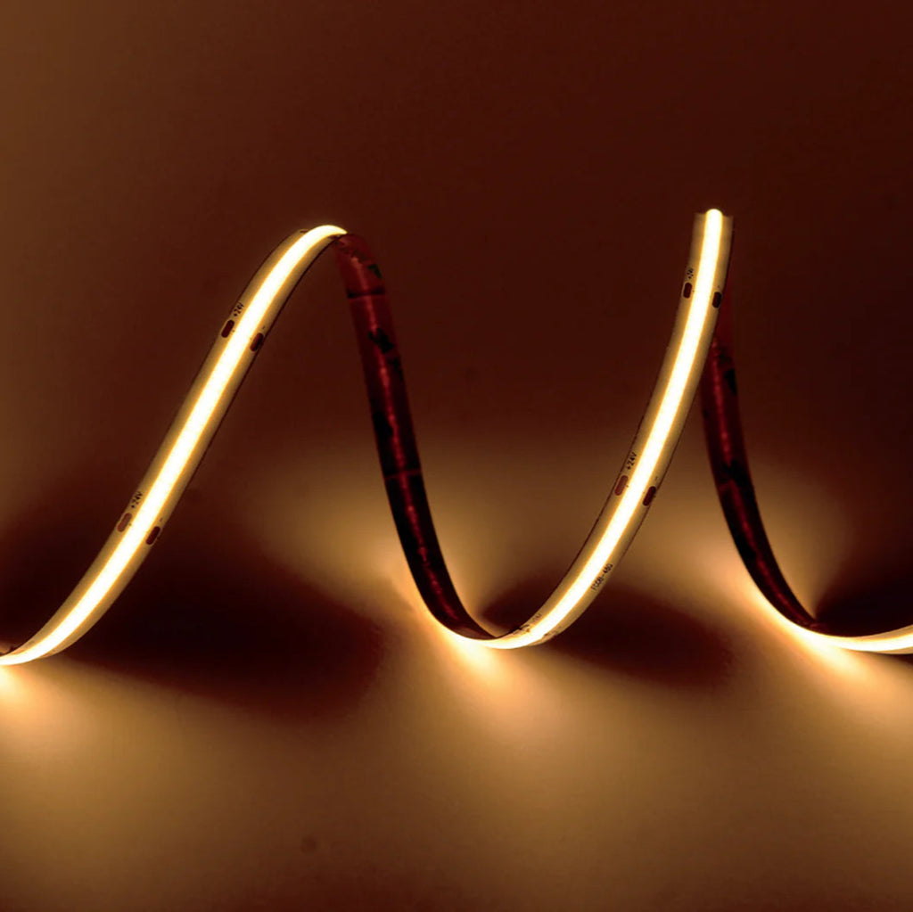Our Dotless COB LED Strip Light uses the new FCOB technology to produce seamless linear lighting with no hot spots or "dead spots". On traditional LED strips, LED diodes are spaced apart creating hot spots that are visible when looking at the strip, but our Dotless LED strips give a consistent light throughout the entire length.