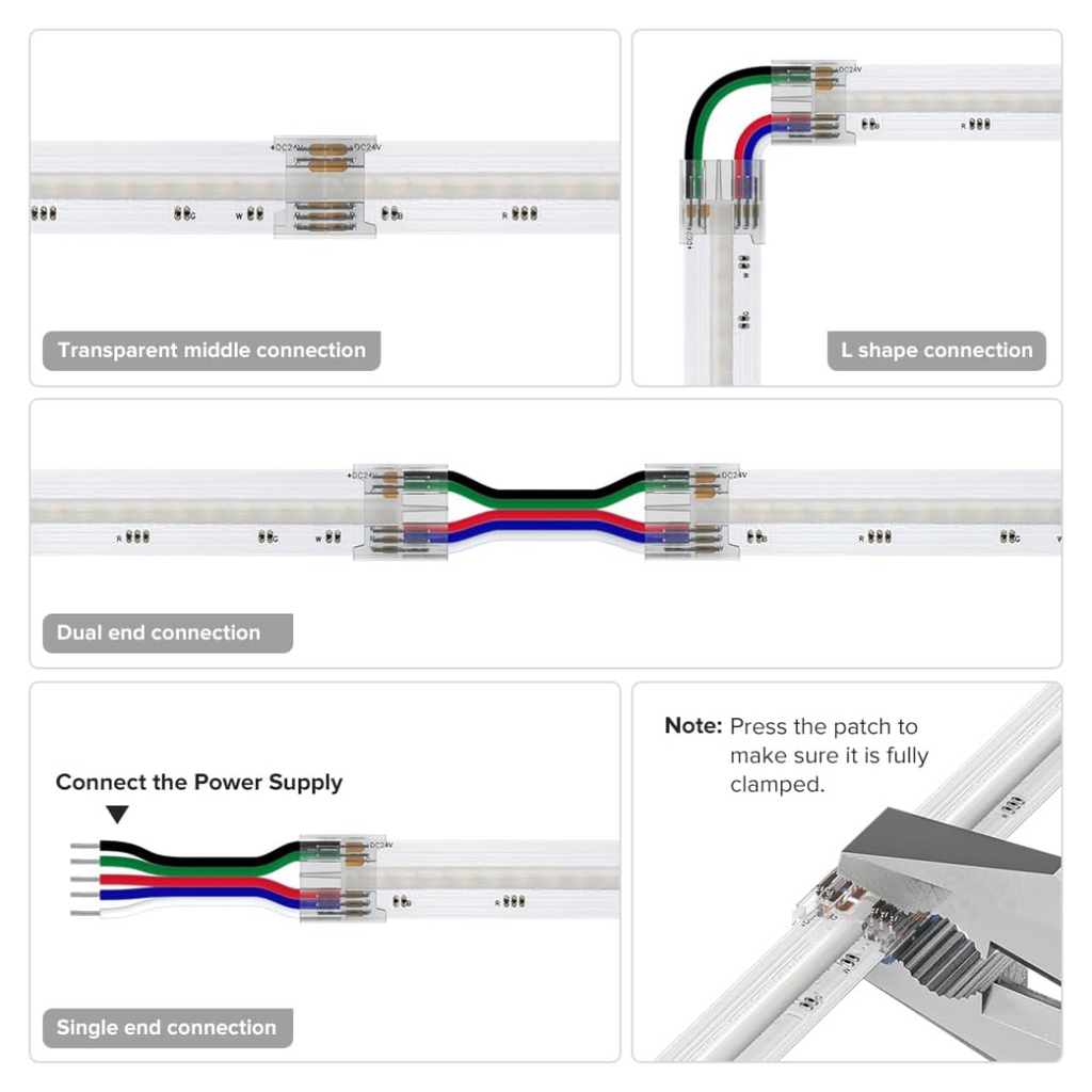 Installation: If used with waterproof strip lights, remove the protective coating so the PCB can be inserted before crimping. Apply waterproofing materials such as silicone sealant or heat-shrink tubes for waterproofing if it will be exposed to moisture or wet areas.
