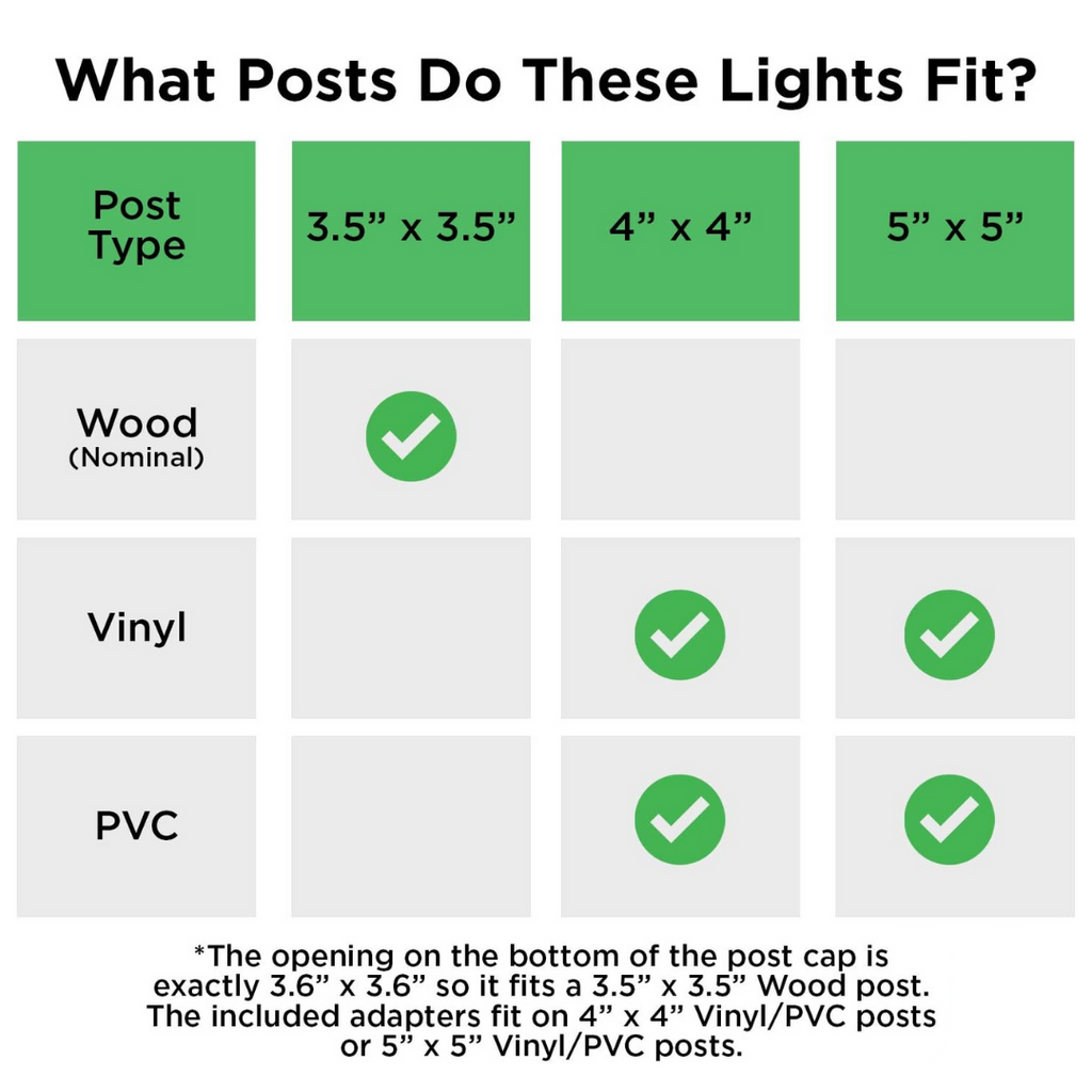 Fits: 4x4 Nominal Wood, 4x4 Vinyl or PVC, and 5x5 Vinyl or PVC posts with included adapters