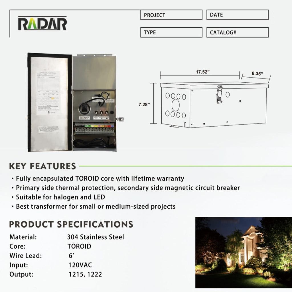 Operating at an input voltage of 120VAC, the RTR900 offers multi-tap outputs at 12V, 13V, 14V, 15V, 16V, 17V, 18V, 20V and 22V, providing flexibility for various lighting setups. The transformer is backed by a limited lifetime warranty, ensuring peace of mind and reliability for years to come.