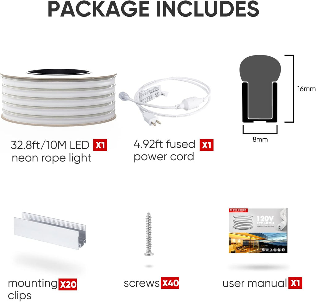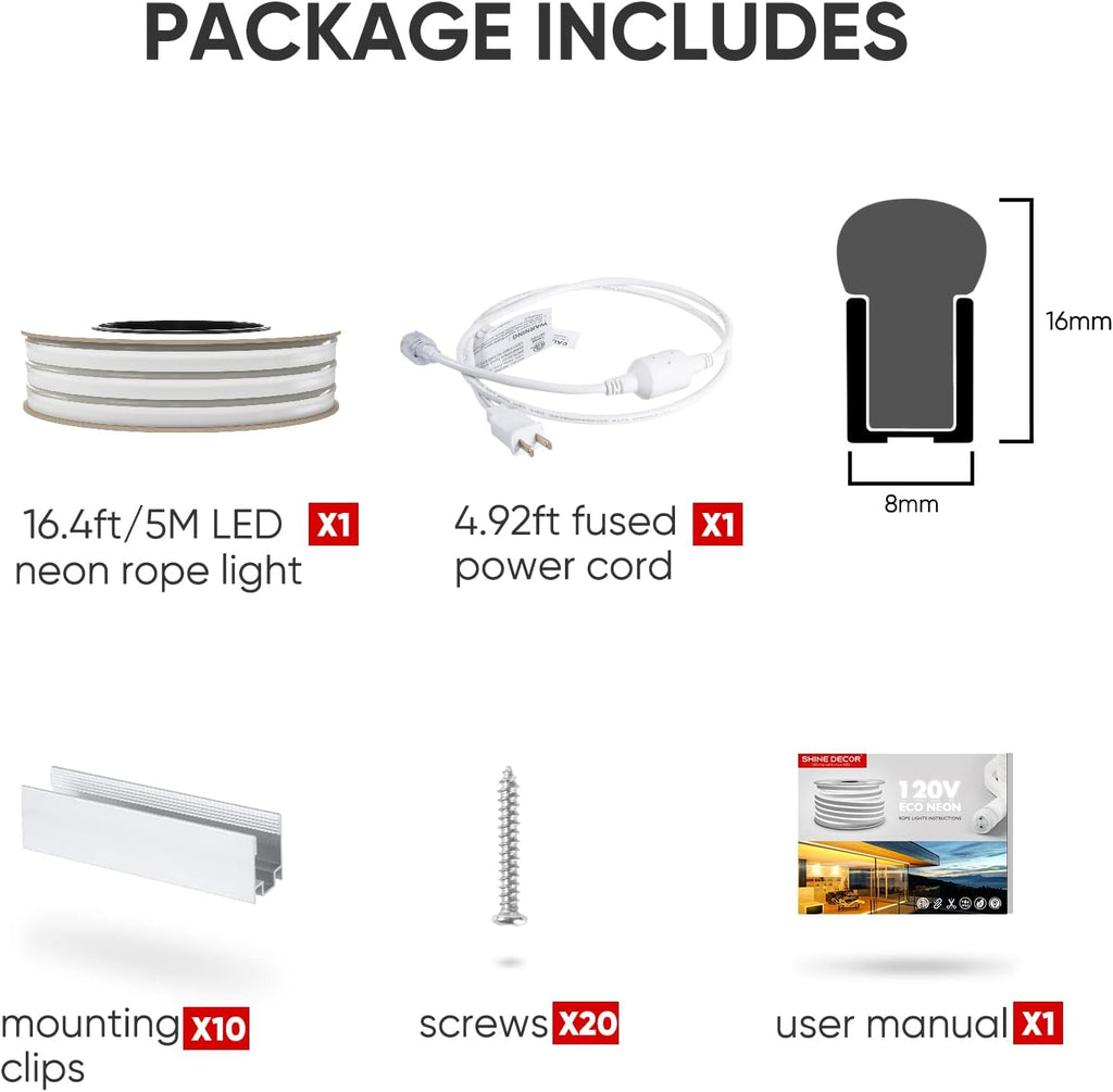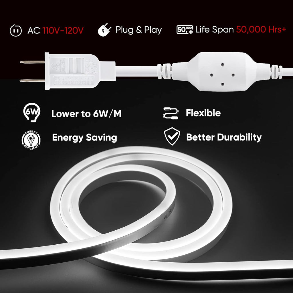 SLN06 Dotless Neon LED Strip Light 110-130V 8mm (W) x 16mm (H) IP65 Outdoor Rated Dimmable High Voltage Silicone Strip Light with Mounting Clips, Screws with Power Cable