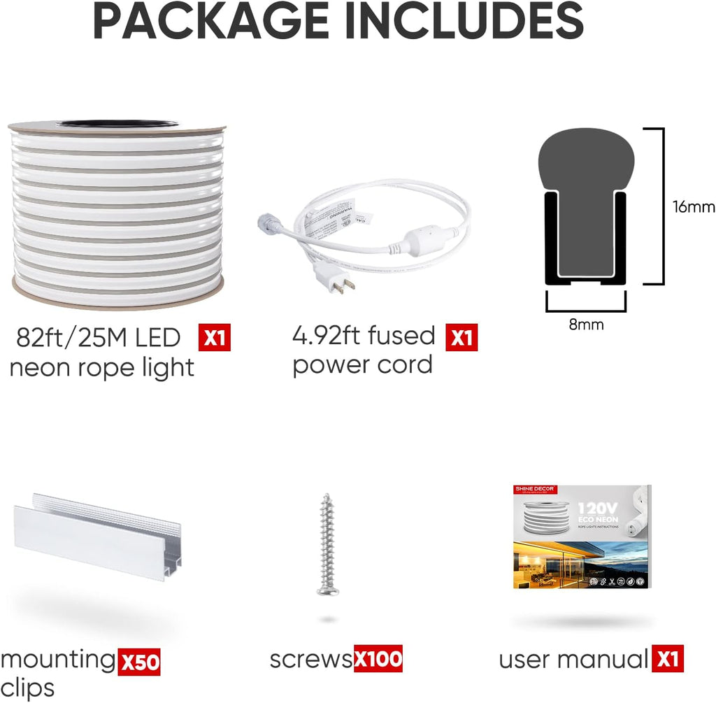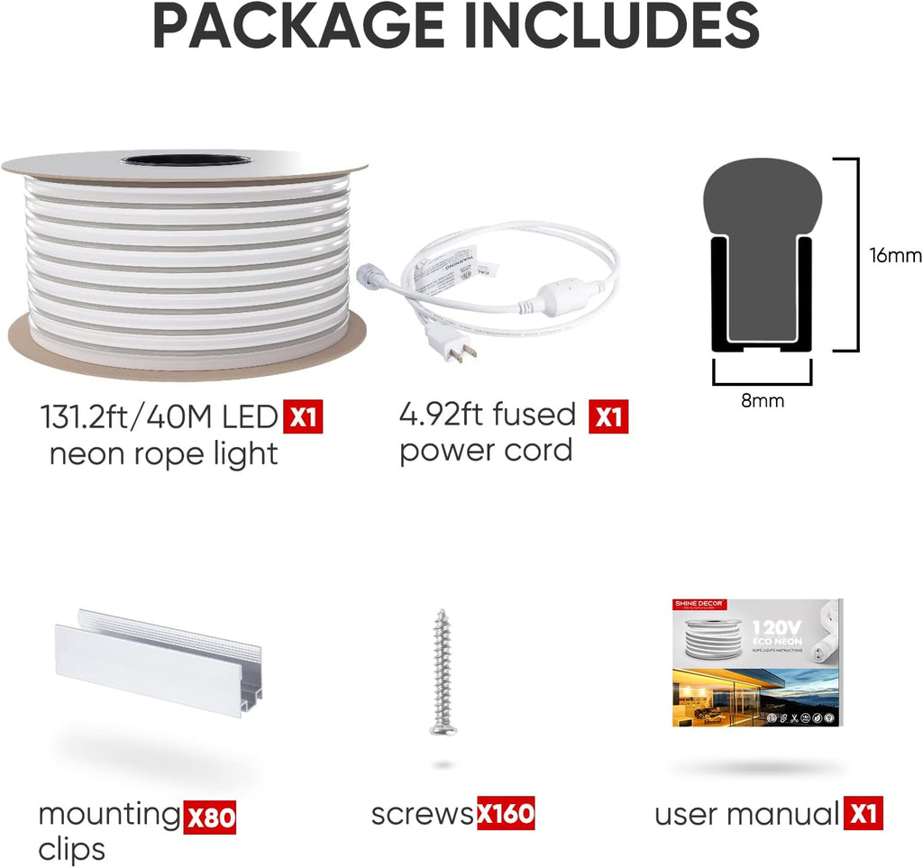 Neon Rope Light (8mm W x 16mm H) is ETL-listed with pure copper wiring for enhanced safety. Crafted from thick, anti-yellowing, and flame-retardant silicone material, it offers durability and a long lifespan of over 50,000 hours. The 110-130V AC plug-and-play setup eliminates the need for a DC adapter, and a spare fuse is included for added convenience. For hardwiring, professional installation is recommended.