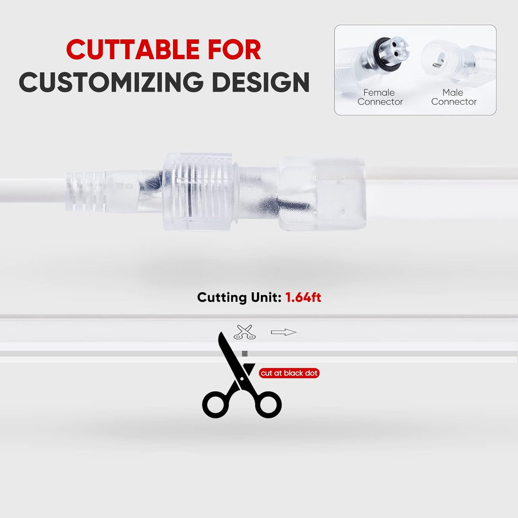 This flexible neon rope light supports male-to-female end-to-end connections, allowing you to extend up to 164 ft (50M) with one power cord. It’s also cuttable every 1.64 ft (0.5M) for DIY projects, with a minimum bending radius of 4cm for creative applications.