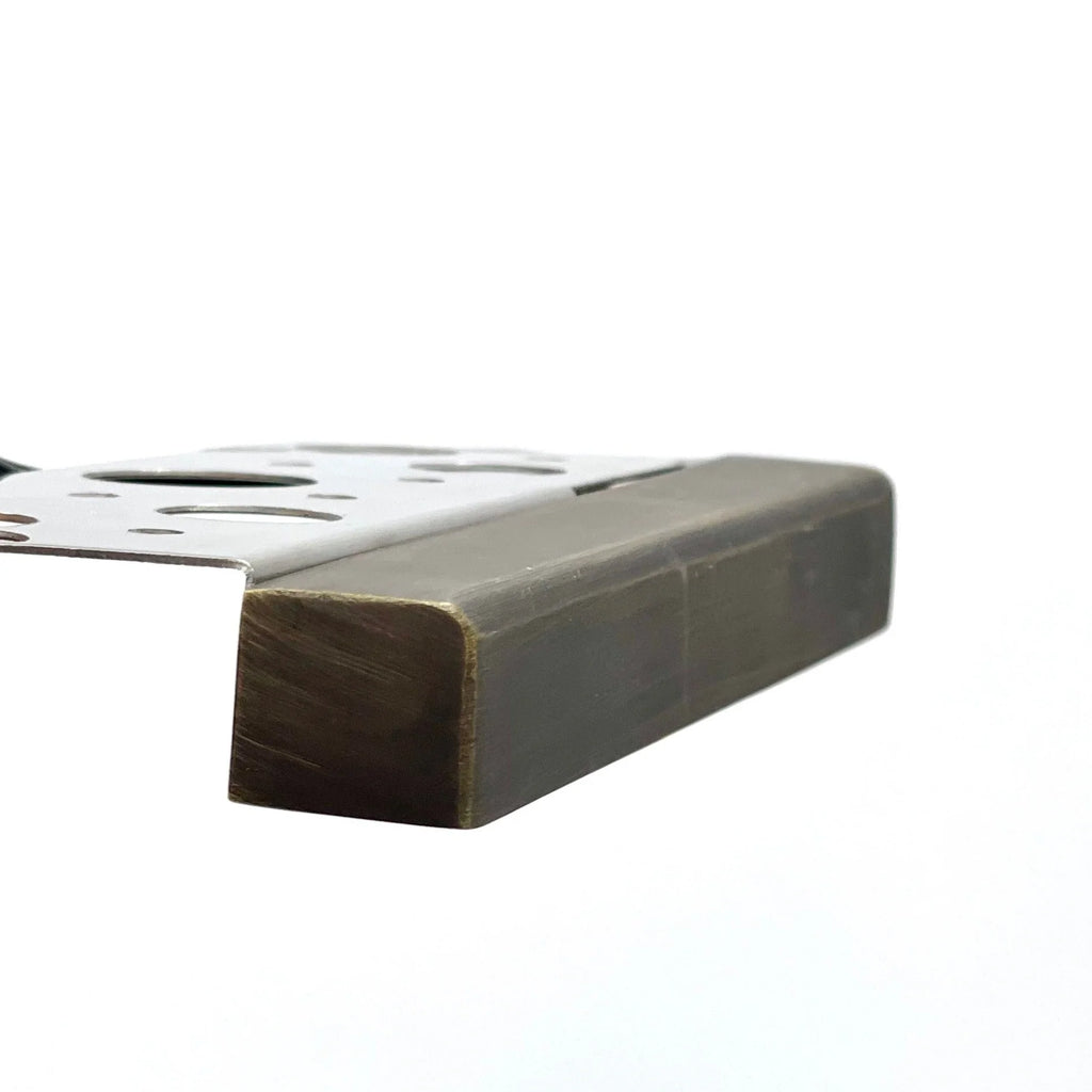 The first mounting option is a long bracket that is already affixed to the fixture upon purchase (as depicted in the first image). This option allows for the secure placement of the bracket on a wall, by positioning another brick or stone atop the bracket. The bracket is then secured in place by utilizing the retaining wall screws and anchors from the top side of the mounting bracket.