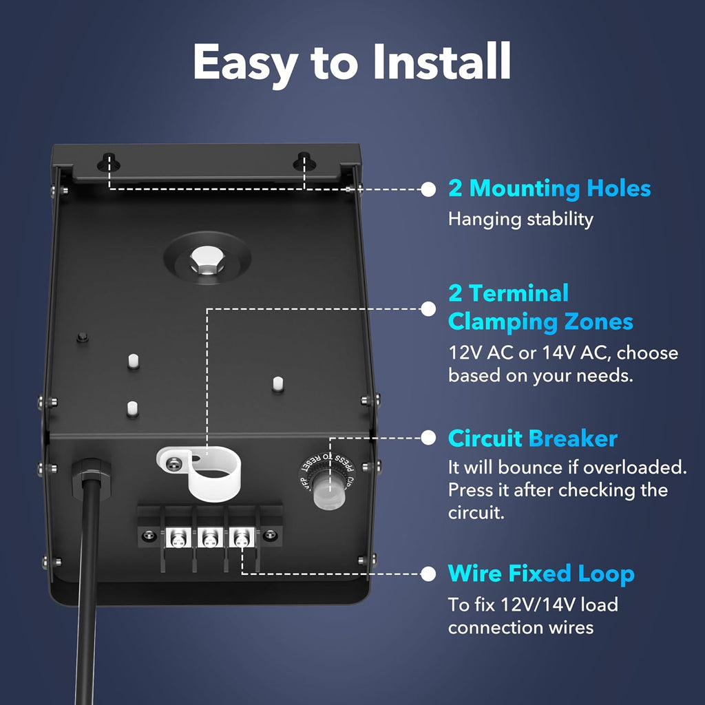 With features like automatic timing, versatile compatibility, and smart control options, this transformer offers a seamless solution for your outdoor lighting needs while prioritizing safety and durability.